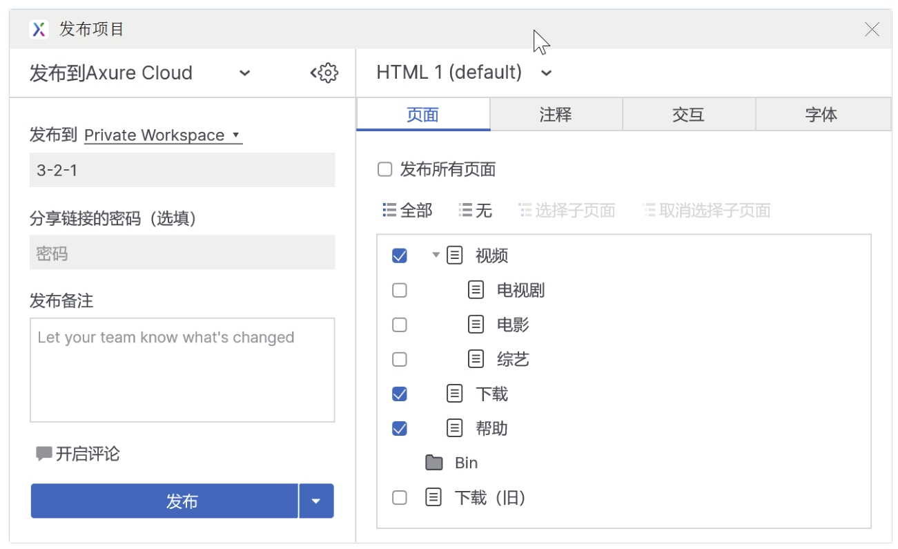 当需要导出产品原型时,只需选择导出原型中合理、优秀的部分即可,不需要全选页面,如图3-100所示。这样既可以向客户分享一个简洁的版本,也可以随时访问旧版本。