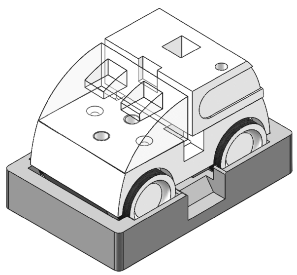 托盘在传送带移动到指定位置后,三轴直角坐标机械手通过直线运动和旋转运动将汽车零件按照车轮、车尾、车头、车身、底盘的顺序放入托盘。小车零件托盘的三维结构如图2-2所示。