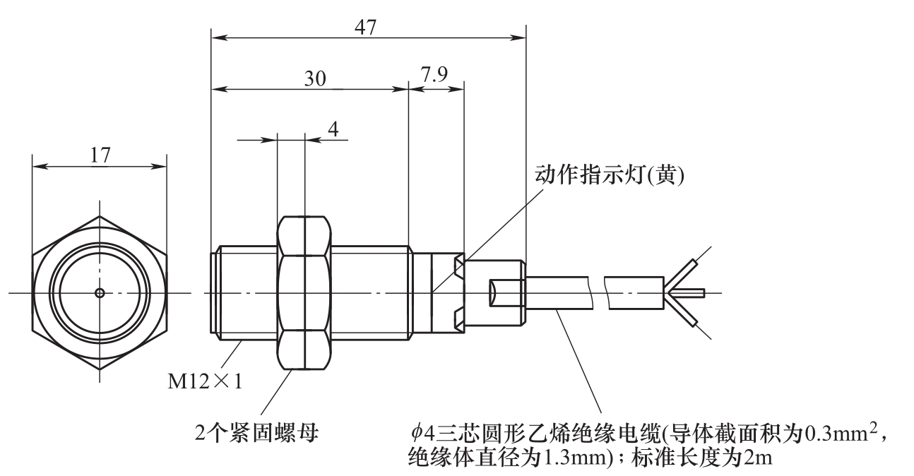 该接近开关的螺纹长度为标准型,三极管的输出类型为PNP型,可以通过MS标准螺纹孔来连接,E2B-M12KS02-WP-B1的二维结构如图2-19所示。