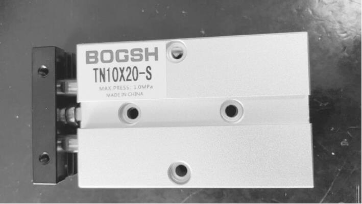 小车托盘在自动化生产线起始端由气缸控制推出,通过流水线输送到定位装置处,小车托盘气缸选用TN系列TN10-20S型双杆气缸,其中TN表示复动型双轴气缸,10表示缸径为10mm,20表示行程为20mm,S表示附磁石,双杆气缸实物外形如图2-18所示。