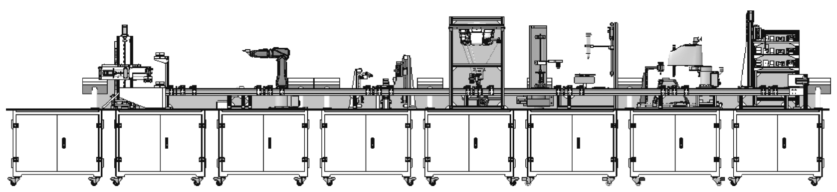 汽车模型柔性自动化生产线传送带的主要功能是根据生产流程,将汽车模型零件托盘传送到某个工作台上的加工工位,固定托盘后对托盘上的零件进行加工,加工完成后,将零件放回托盘,然后传送带将零件托盘传送至下一个工作台的加工工位。