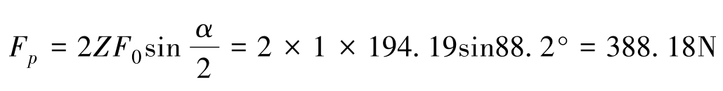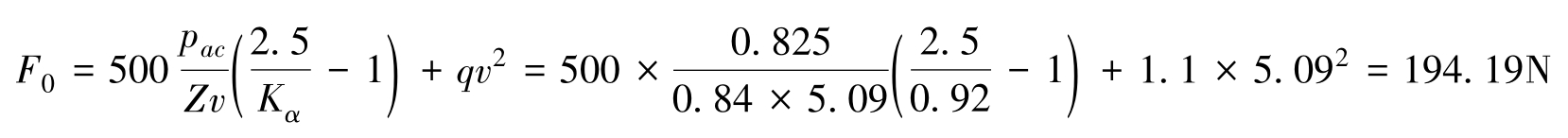 其中, p ac 为计算功率(kW), Z 为带的根数, v 为带的传动速度(m/s), K α 为包角修正系数,查表可得数值为0.92, q 为V带单位长度质量,本设计选取 q =1.1kg/m。