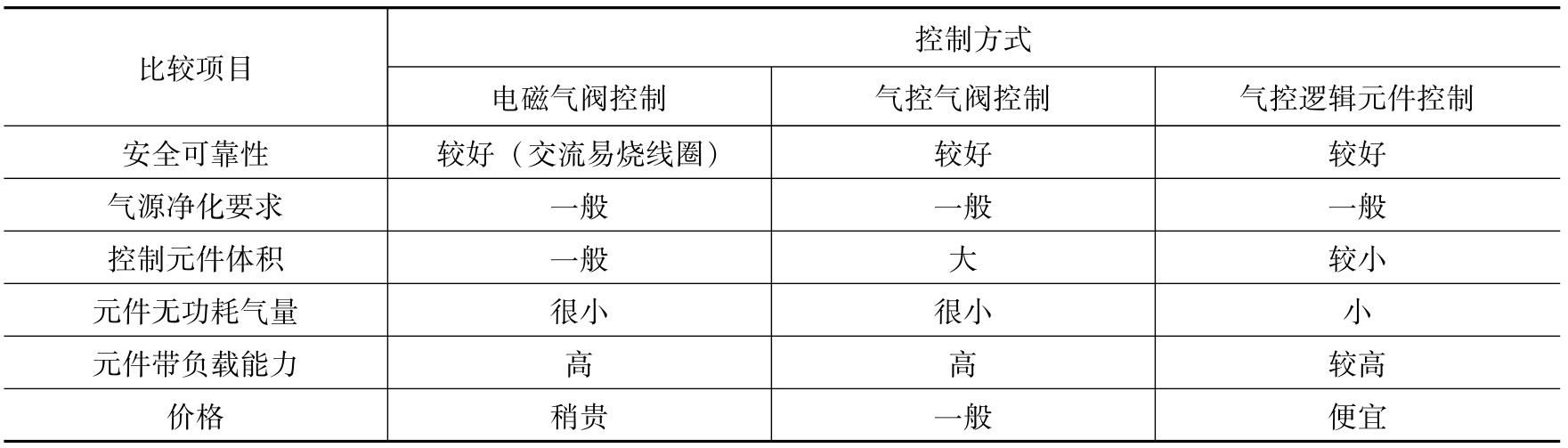 电磁气阀控制、气控气阀控制及气控逻辑元件控制三种气动元件控制方式在安全可靠性、气源净化要求、元件体积控制、元件无功耗气量及元件带负载能力等方面的性能都有所差异,其性能比较见表2-2。比较三种气动元件控制方式的性能特点后,结合本设计的实际情况后,选用气控气阀控制方式。
