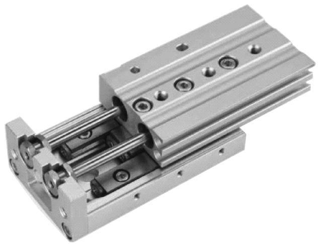 本设计汽车模型柔性自动化生产线中的传送带使用了滑台气缸,滑台气缸是将滑台与气缸相结合的气动元件,一般用于精密仪器的搬运输送,精度较高。本设计中的滑台气缸主要用于当小车托盘移动到某个工作单元时,阻止小车托盘沿传送带继续前行,同时固定小车托盘。