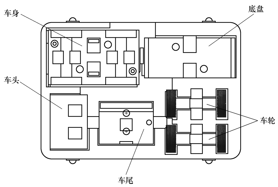 完成小车零件喷涂工序后,进行装配,传送带将托盘传送至车身装配单元,机械手夹取车身放置于装配工作台上,然后依次夹取放置每一个零部件,直至完成整体装配。小车装配体如图2-9所示。