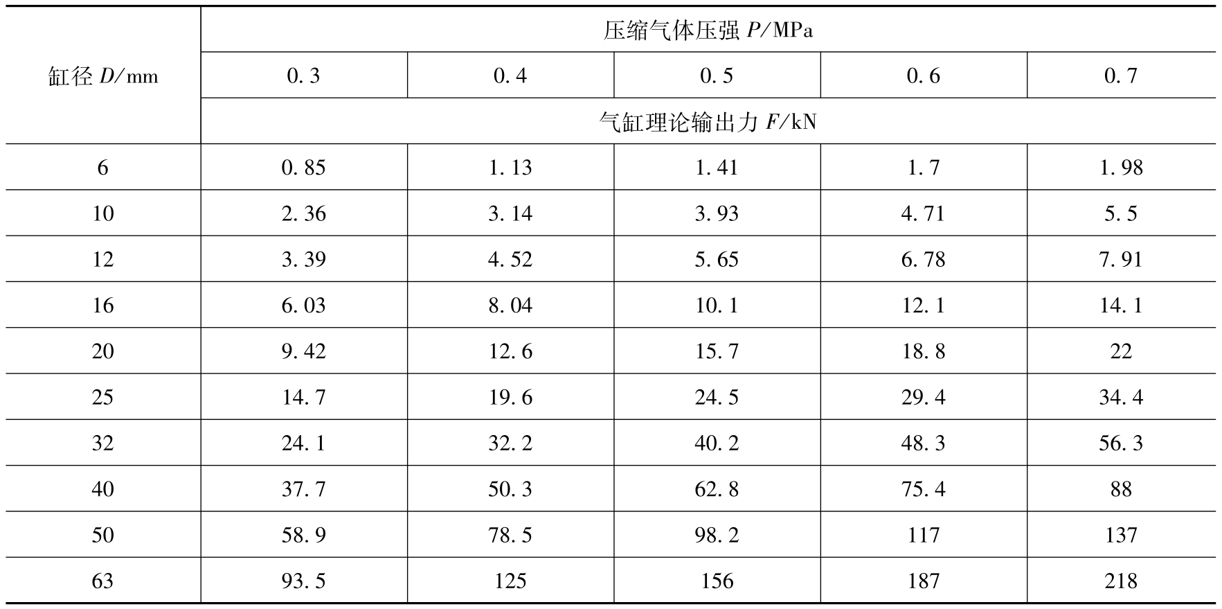 其中, D 为气缸直径(mm); p 为气缸的工作压强(MPa)。