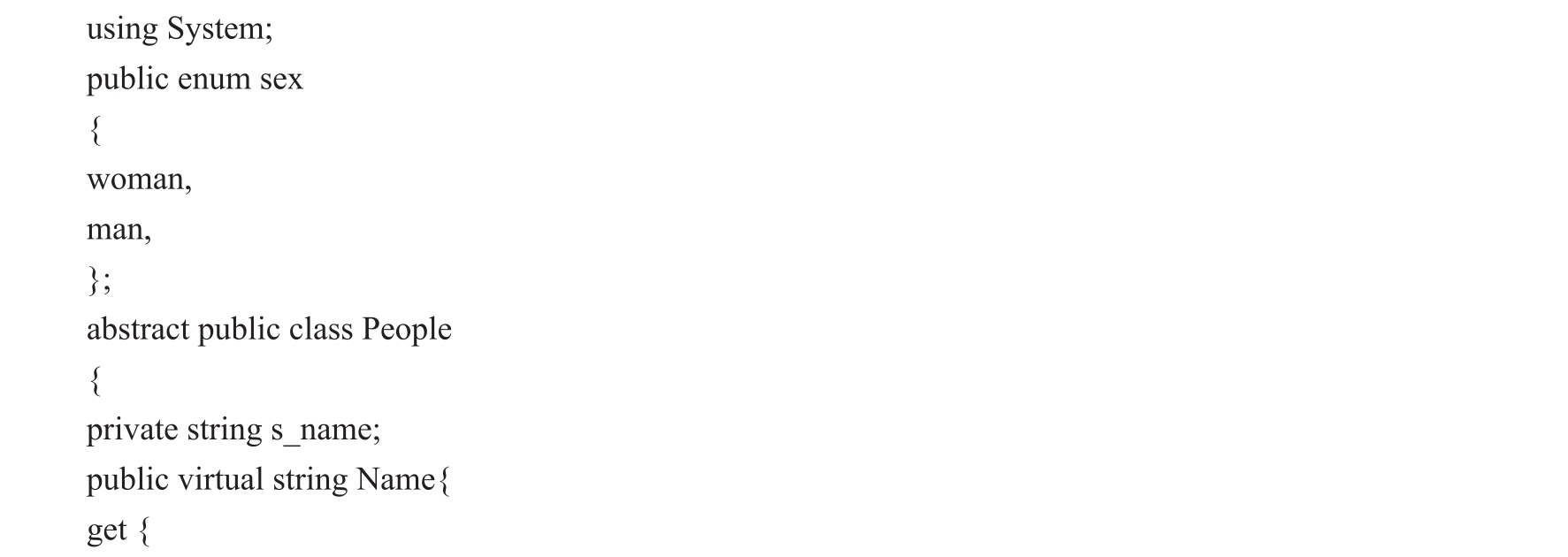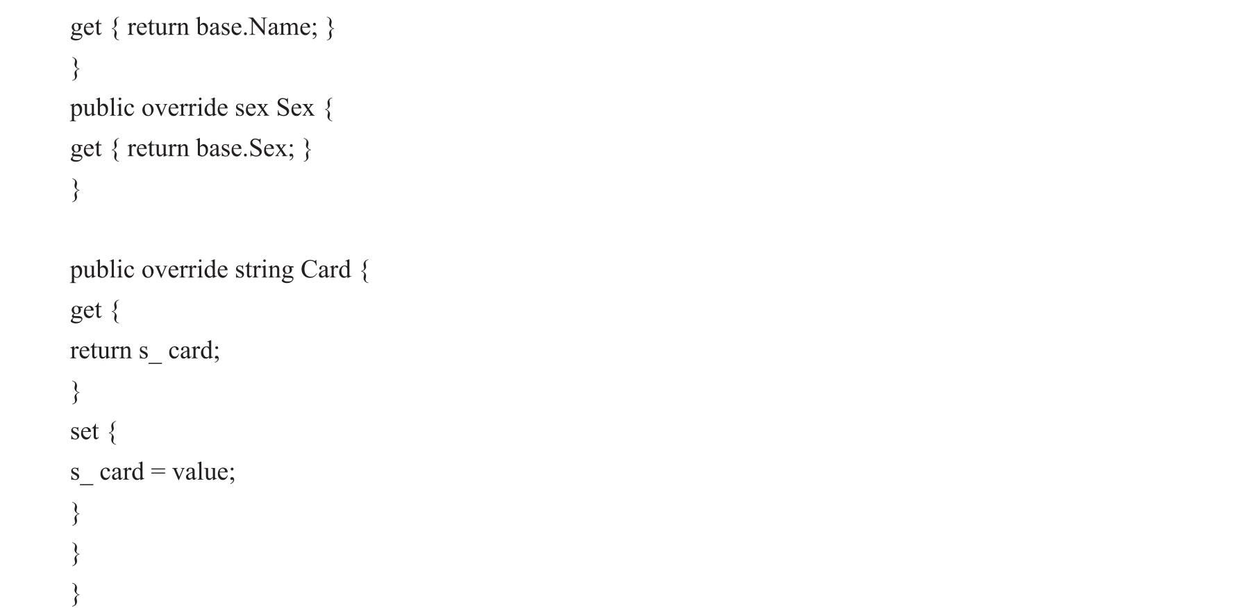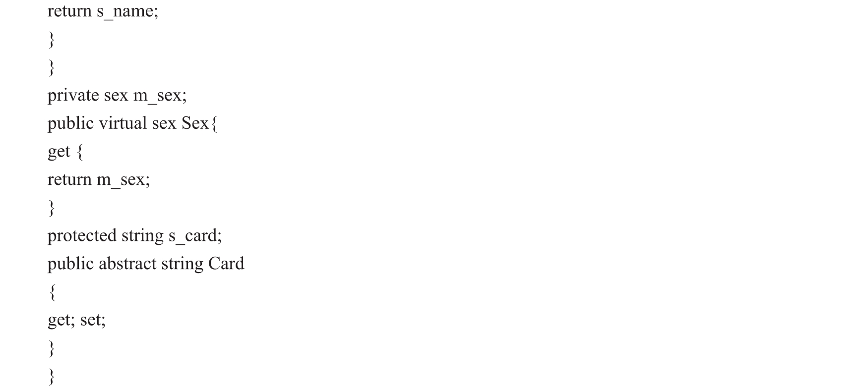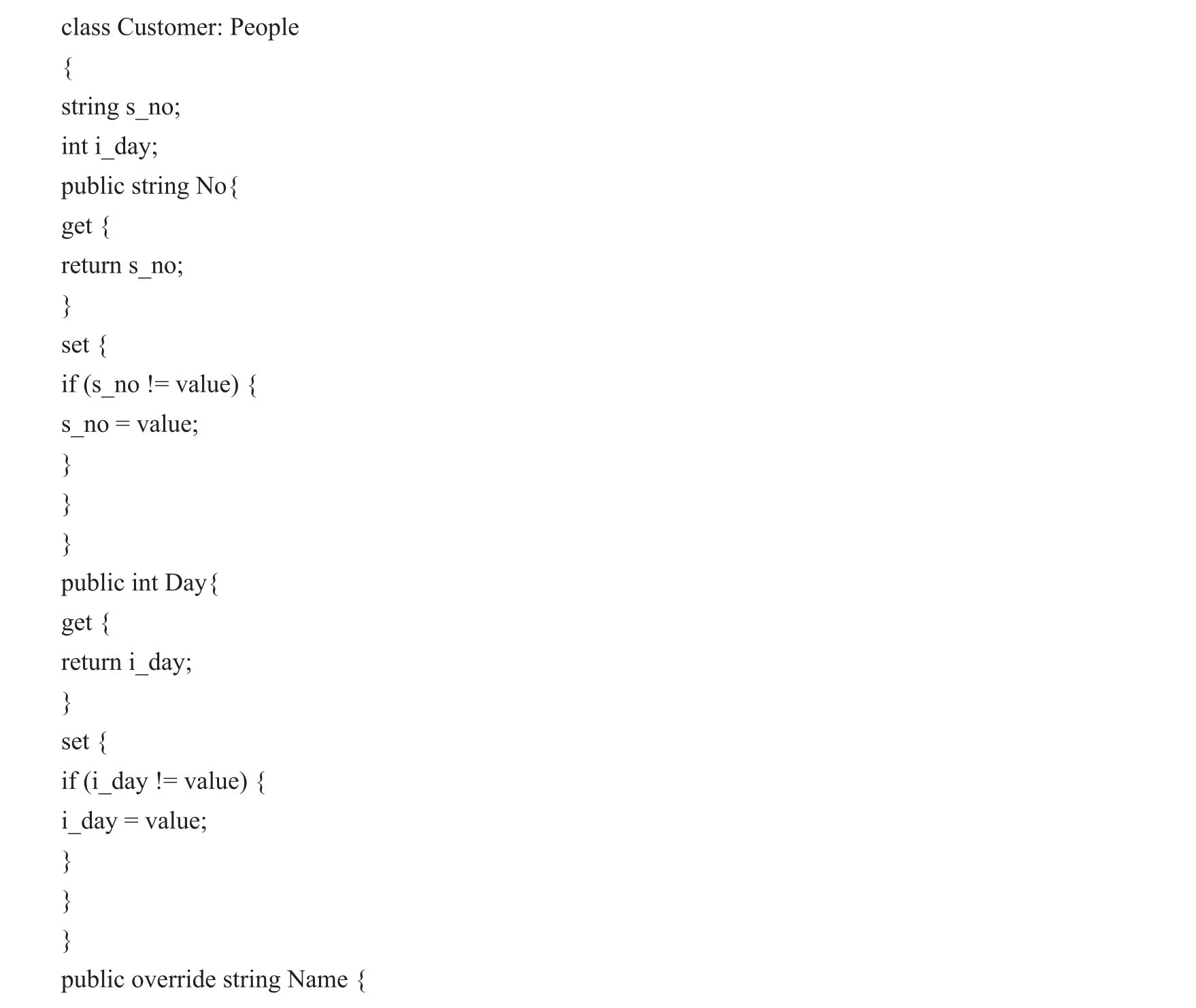 在类Customer中,属性Name、Sex和Card的声明都加上了override修饰符,属性的声明都与基类People中保持一致,Name和Sex的get访问器、Card的get和set访问器都使用了base关键字来访问基类People中的访问器,属性Card的声明重载了基类People中的抽象访问器,这样在Customer类中没有抽象成员的存在,Customer可以是非虚的。
