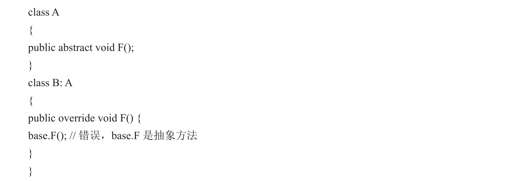 还要注意抽象方法在派生类中不能使用base关键字来进行访问,例如下面的代码在编译时会发生错误: