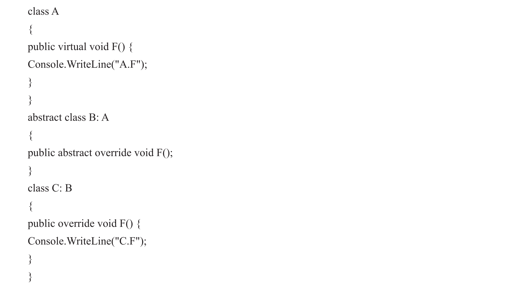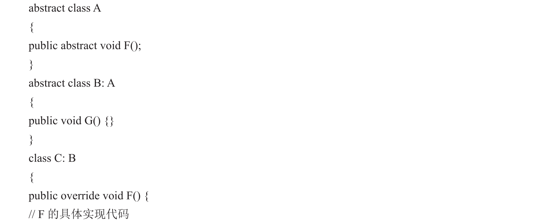类A声明了一个虚方法F,派生类B使用抽象方法重载了F,这样B的派生类C就可以重载F并提供自己的实现。