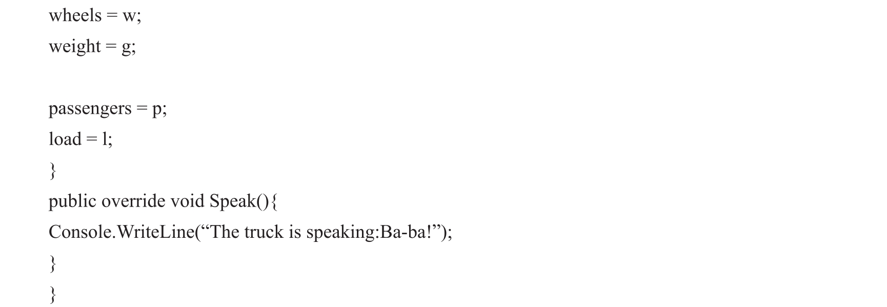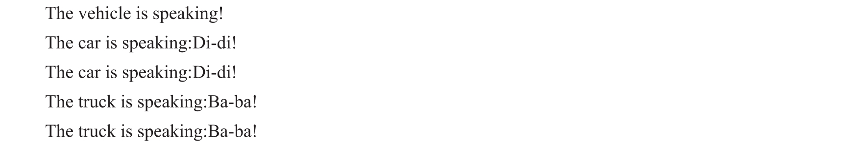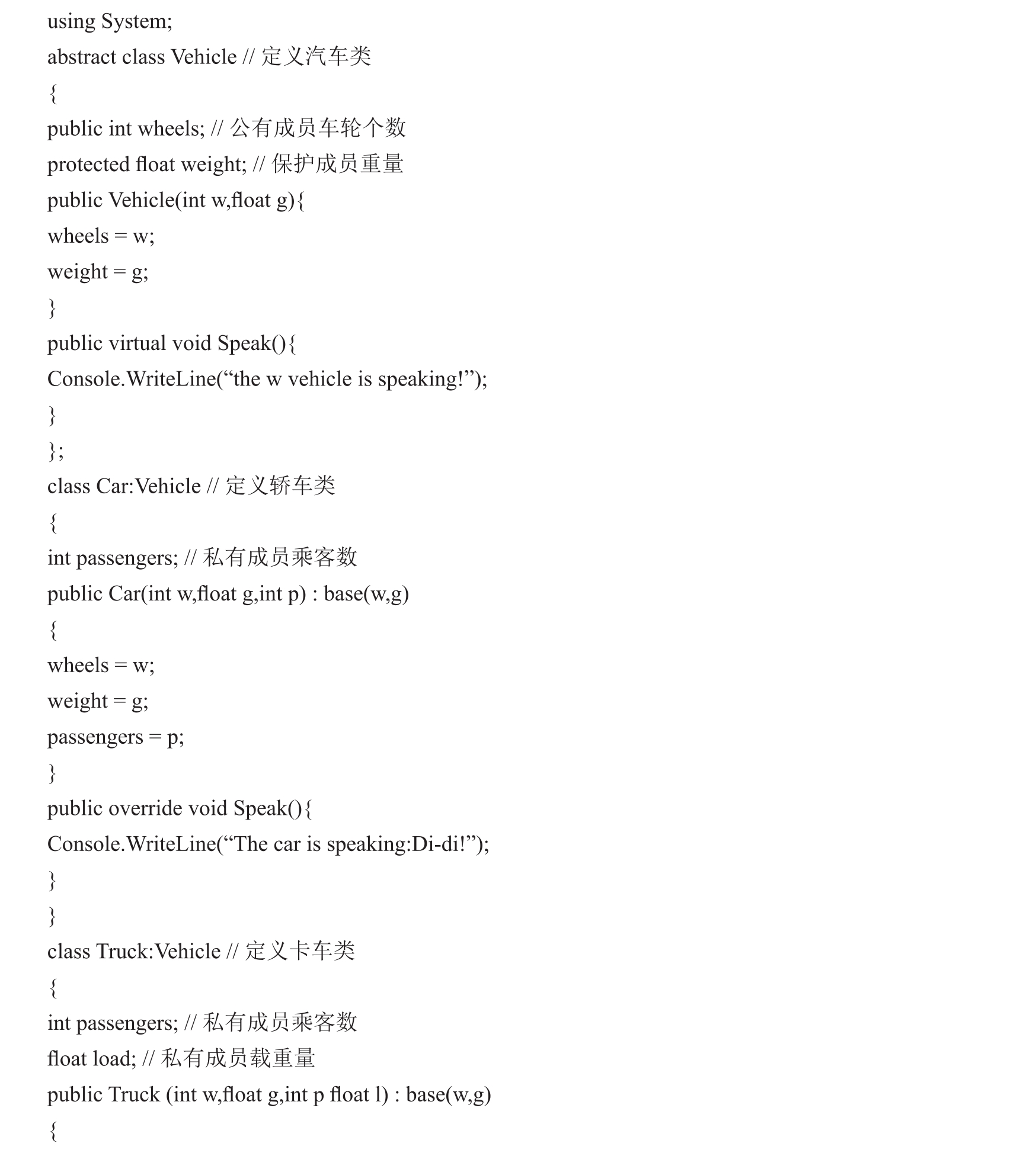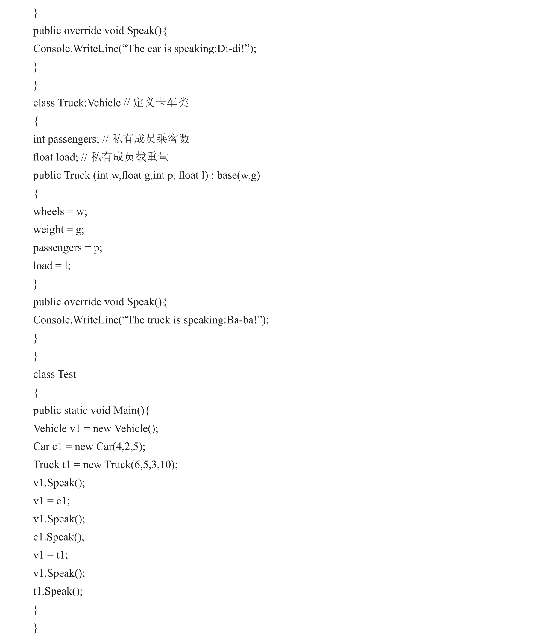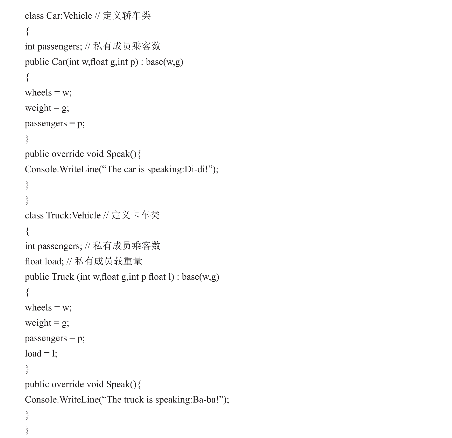 2)在派生类Car和Truck中,分别重载了Speak方法,派生类中的方法原型和基类中的方法原型必须完全一致。