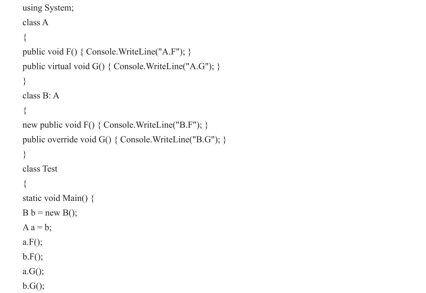 例子中类A提供了两个方法:非虚方法F和虚方法G。类B则提供了一个新的非虚方法F,从而覆盖了继承的类F,B同时还重载了继承的方法G,那么输出应该是