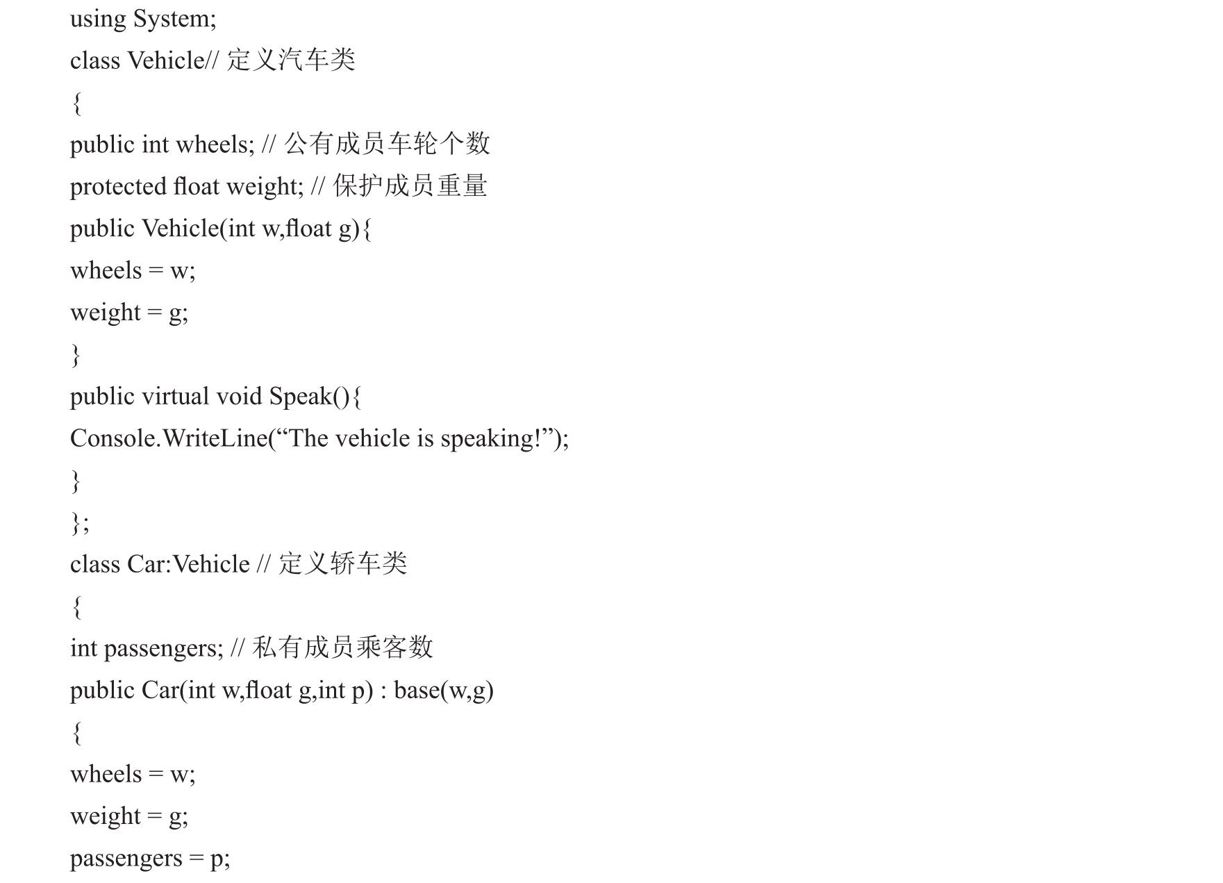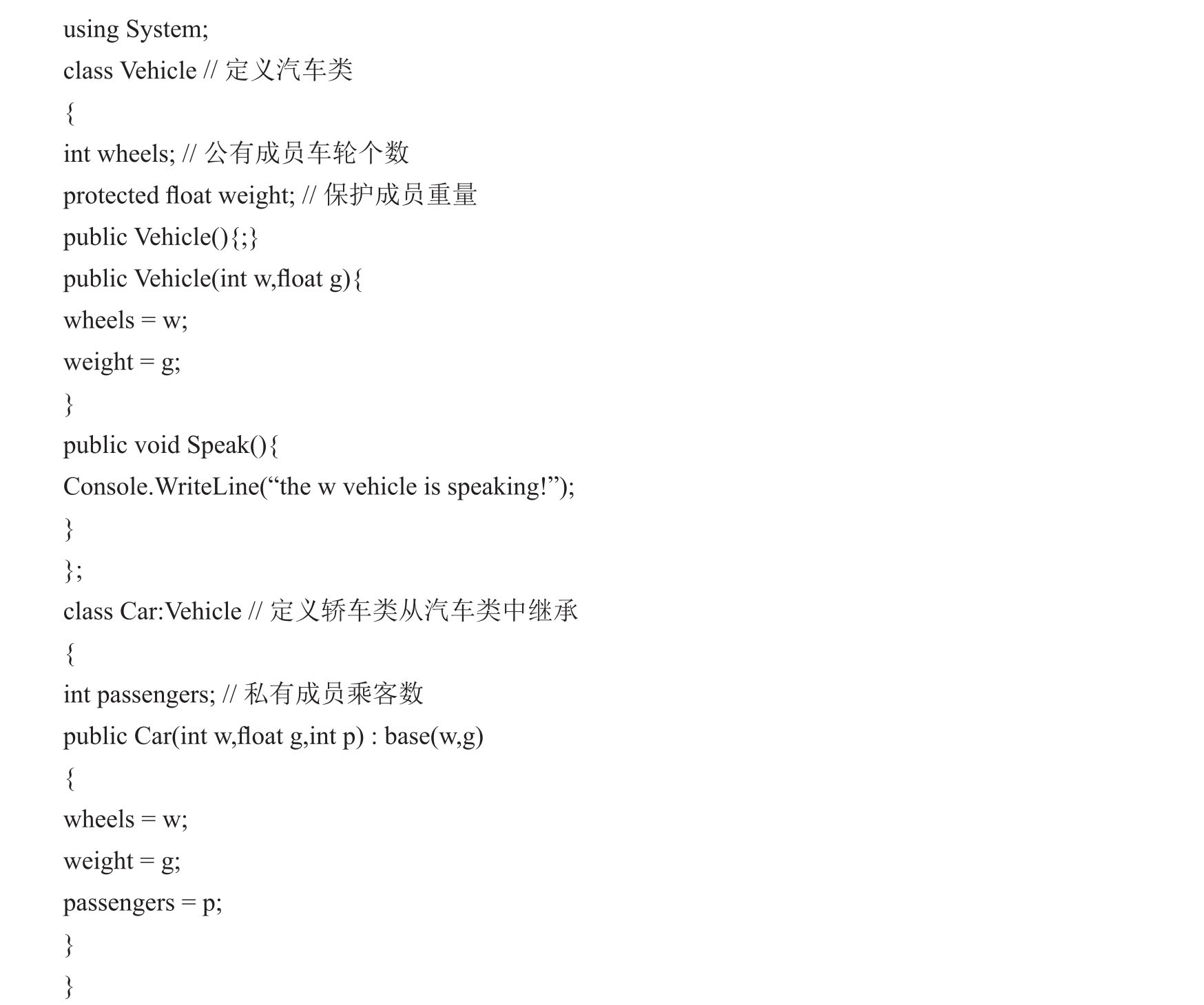 Vehicle作为基类,体现了汽车这个实体具有的公共性质:汽车都有车轮和重量。Car类继承了Vehicle的这些性质,并且添加了自身的特性:可以搭载乘客。C#中的继承符合下列规则: