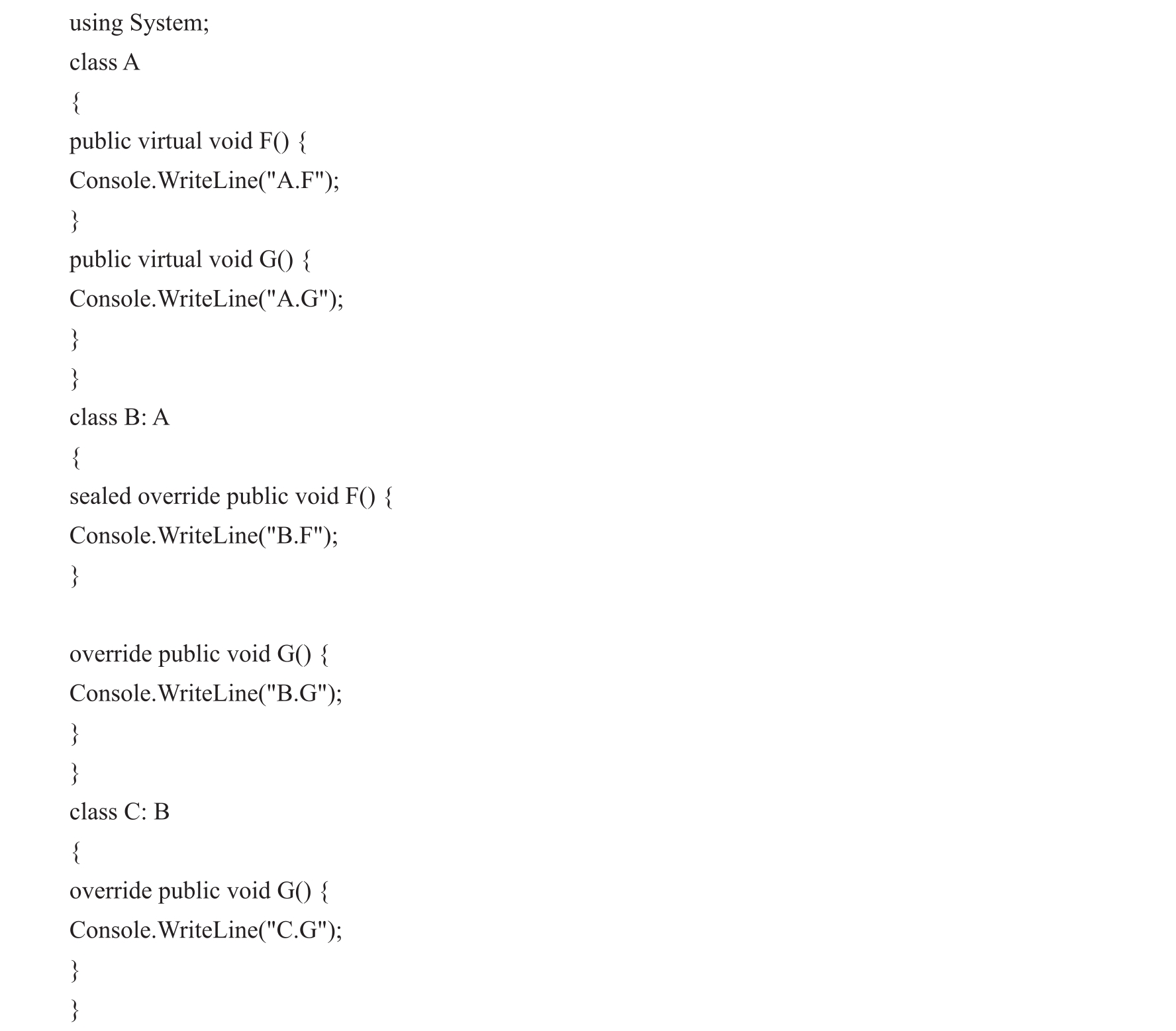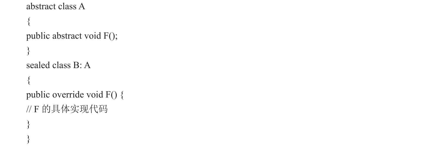 类B对基类A中的两个虚方法均进行了重载,其中F方法使用了sealed修饰符,成为一个密封方法,G方法不是密封方法,所以在B的派生类C中可以重载方法G,但不能重载方法F。