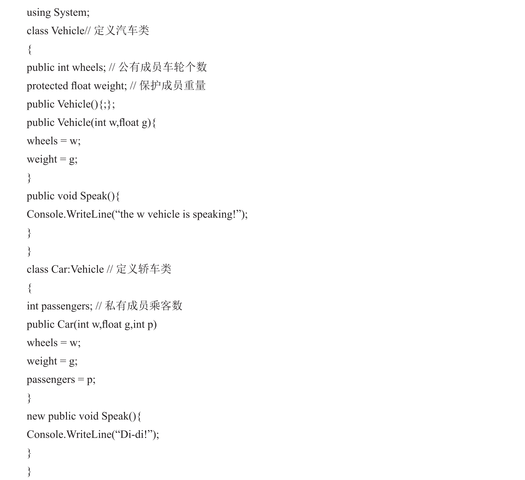 我们上面提到类的成员,声明中可以声明与继承而来的成员同名的成员,这时称派生类的成员覆盖了基类的成员,这种情况下编译器不会报告错误,但会给出一个警告。对派生类的成员使用new关键字,可以关闭这个警告。前面汽车类的例子中,类Car继承了Vehicle的Speak方法,可以给Car类也声明一个Speak方法,覆盖Vehicle中的Speak,见下面的代码: