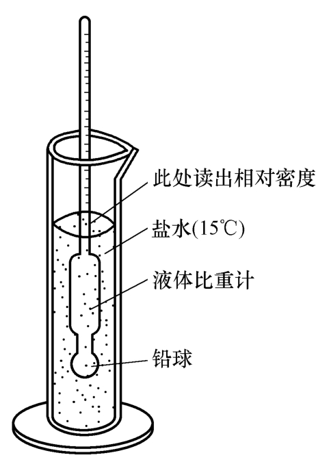 图2-9所示为盐水密度的测定方法,将盐水放入量筒中,盐水的温度应保持在15℃(用温度计测得),把液体比重计放入盐水中,在盐水液面处读出密度的数值。