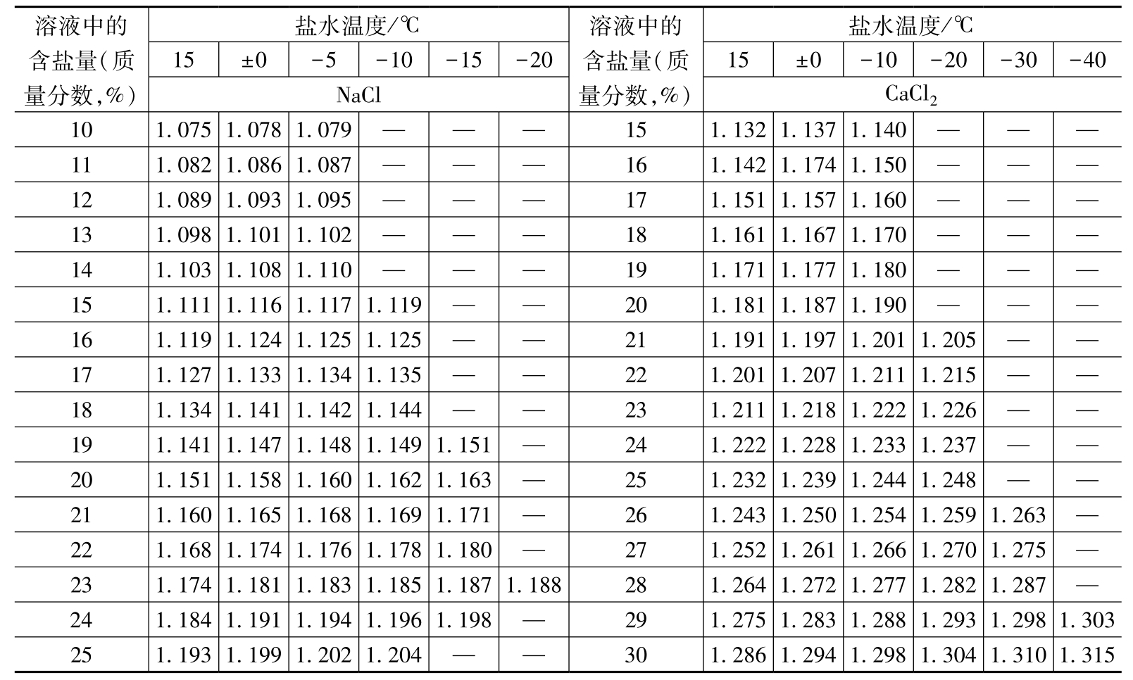表2-10 NaCl及CaCl 2 盐水的密度(单位:kg/L)