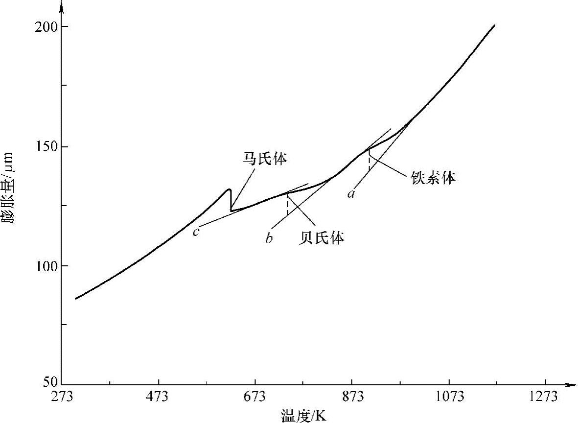 材料在发生相变时,晶格结构的改变将导致试样的体积变化。在同样的温度下,奥氏体的比容最小。当发生相变时,热膨胀(DIL)曲线上会出现相应的波动,波动的起始点和结束点即表示相变的开始和结束温度,结合材料的热胀冷缩效应和相变膨胀,相应的相变膨胀量也可以在DIL曲线获得。因为相变的开始和结束温度等都是通过在DIL曲线上做切线后获得,故将该处理方法定义为切线法。