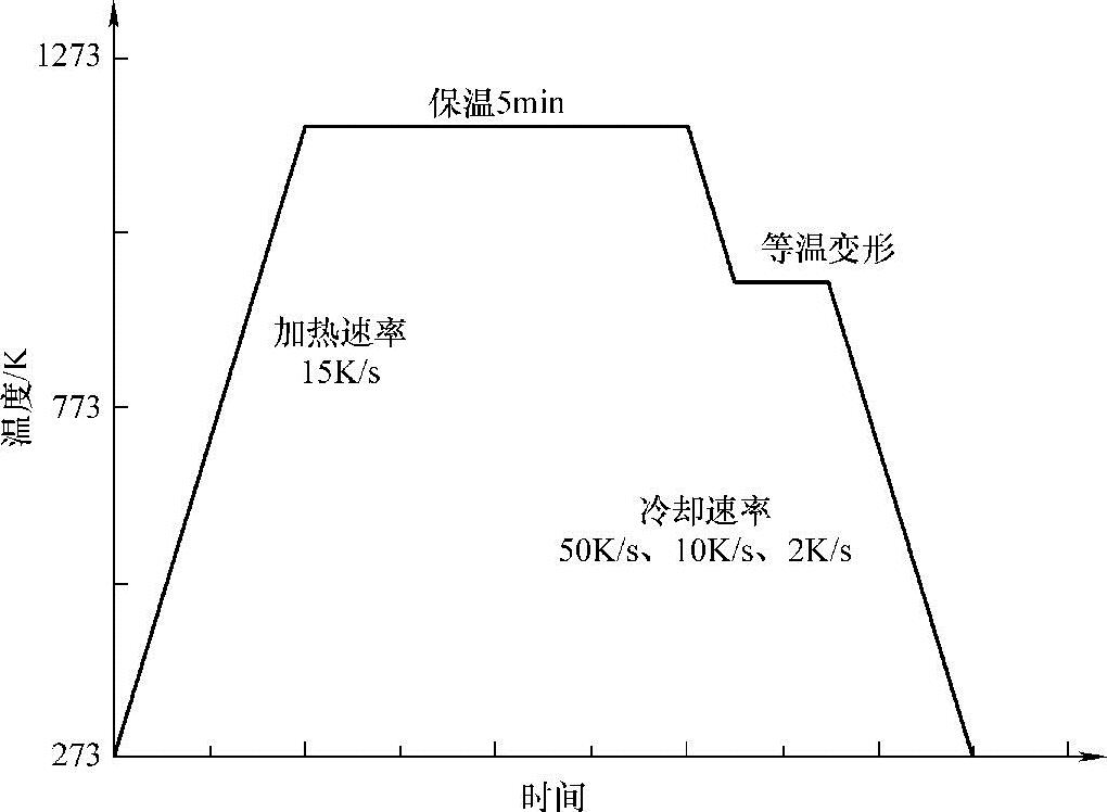 为了研究不同的保温温度对硼钢板相变的影响,根据马氏体、贝氏体及铁素体相变的不同温度范围选择了不同冷却速率下的多种保温温度。冷却速率为2K/s时,保温温度分别选择1073K、1023K、973K、923K和873K;冷却速率为10K/s时,保温温度分别选择1073K、973K、873K、823K、723K、623K、573K和473K;冷却速率为50K/s时,保温温度分别选择773K、673K、573K、523K和473K。全部试样均在保温温度停留5min。保温阶段完成后,试样继续以保温前的冷却速率淬火到室温(图2-11)。