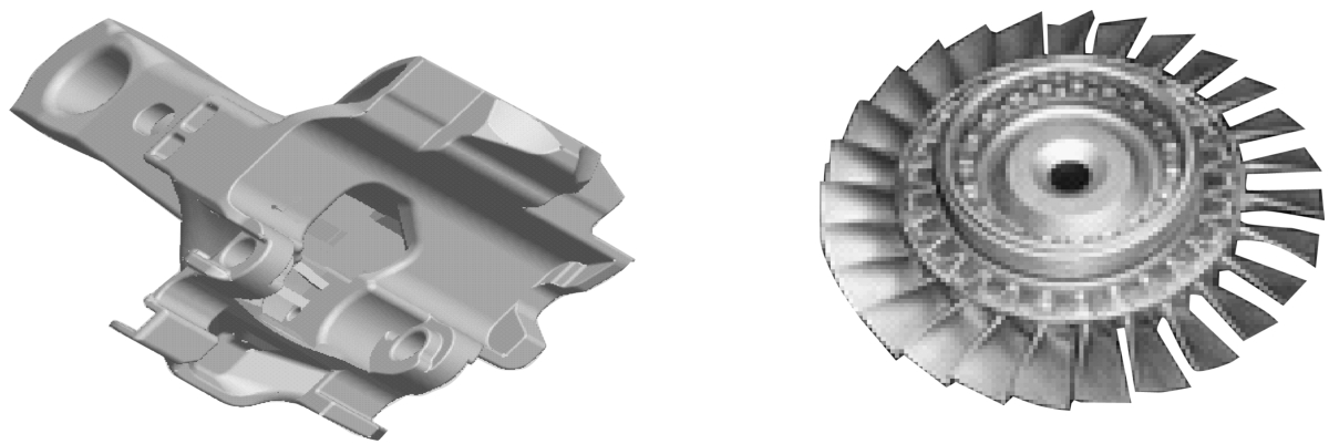 理论上,任何一个结构都可以视为三维结构,但是在工程上只有当一个结构的三个坐标方向的尺度不是相差很大时才归类为空间三维结构,例如车辆牵引车钩中的铸件,柴油发动机的机体,增压器的涡轮等,它们都属于空间三维结构,图3-2给出了两个三维实例。