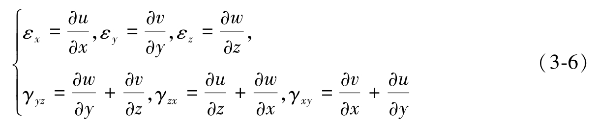 同样以图3-3所示的微小六面体为参考,在外力作用下将发生微小形变。当处于平衡状态时,应变和位移的几何关系将满足一个方程,即几何方程