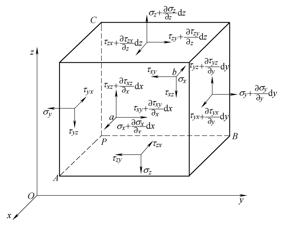 图3-3是参考文献 [12] 给出的空间结构中的一个微小六面体隔离体,以及这个隔离体上的应力变化示意。