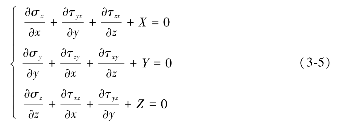 方程中 X 、 Y 、 Z 是体力,其余未知应力分量定义参见图3-3。式(3-5)的物理意义是:在任何一个坐标方向上,作为内力的体力控制了应力分量的变化,且应力分量的变化是协调的。式(3-5)虽然形式简洁但是不能被直接求解,因为未知的应力分量数多于方程数而需要补充应变和位移的关系。