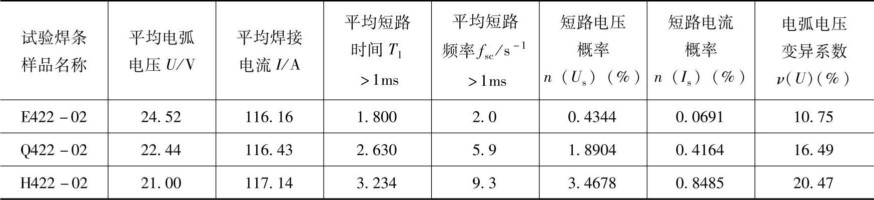 焊条在焊接过程中熔滴的短路行为引起电弧电压的明显波动,显然短路频率越高,短路的时间越长,电弧电压的标准偏差和变异系数也越大,由汉诺威分析仪测试得到的电弧电压变异系数反映了E422-02、Q422-02和H422-02三种样品电压的波动情况,间接反映了样品熔滴短路行为的不同特征。