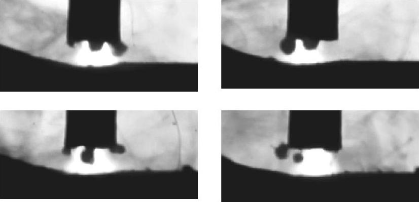列举的两个短路过渡实例的共同特点是:熔滴有较大的尺寸,其直径一般接近或超过焊芯直径;由于熔滴直径大,在正常的弧长操作时,熔滴与熔池发生桥接短路,短路过程伴随着液体金属的过渡;过程持续较长的时间,具有持续性的特点;这里将金属过渡持续时间较长的短路形式称为A型短路。观察图3-1第3、4帧照片,看到熔滴与熔池瞬间发生接触短路,但熔滴没有发生过渡,这种短路现象称之为B型短路 [4,5] 。