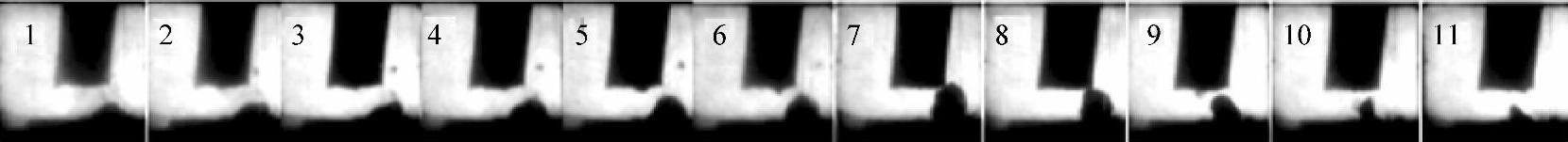 图3-19为已经过渡下去的熔滴发生体积长大的高速摄影照片,支持了关于熔滴中CO气体使熔滴膨胀导致B型短路发生的解释。由图3-19看出,已经过渡下去的熔滴(第1帧照片)由于冶金反应析出气体,并使其喷射出小的颗粒熔体(第2~5帧照片),同时看到它的体积也在长大(第2~8帧照片),之后又很快缩小(第9~11帧照片)。