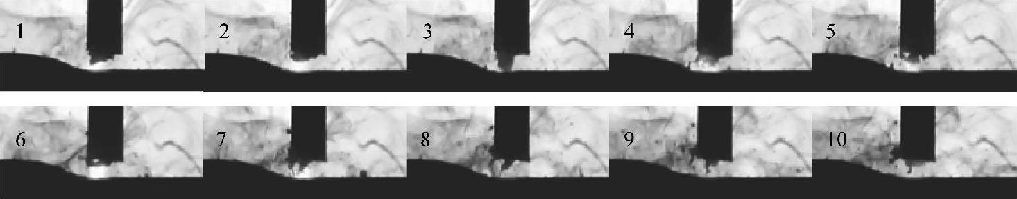 图3-12 钛钙型结构钢焊条形成喷射过渡的高速摄影照片(拍摄速度:1200f/s)