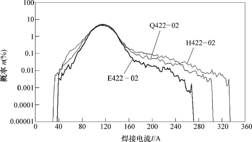 与电压概率密度分布图相对应,从图3-28电流概率密度分布图可以看出,E422-02焊条样品电流分布比较集中,而Q422-02和H422-02样品的曲线更向图中大电流方向移动。