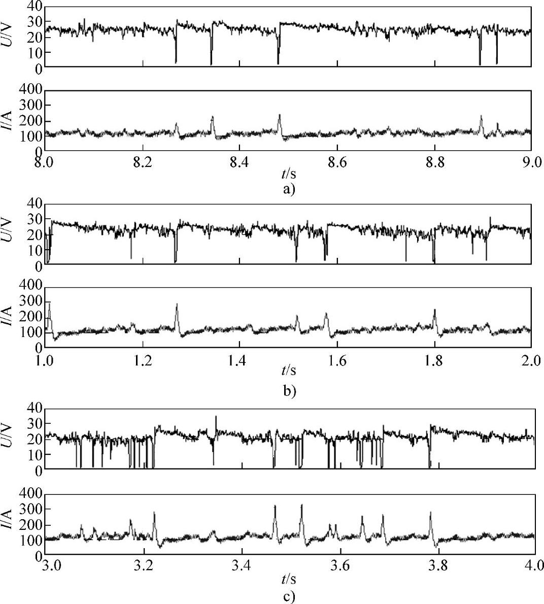 熔滴喷射过渡的最大优点是电弧挺度好,焊接电压与焊接电流的波动最小,而缺点是密集的喷洒飞溅对焊条的工艺性造成负面影响。对422结构钢焊条样品观察时发现,焊接时几乎不发生较大熔滴的短路过渡,爆炸过渡和渣壁过渡也很少出现,主要表现为熔滴的喷射过渡以及掺杂细小颗粒的被撕成块状、片状或带状等无规则形状熔体的过渡,即瞬时C型短路过渡或者完全的不短路的细滴过渡,粗略统计焊条喷射过渡的过渡频率超过100s -1 。