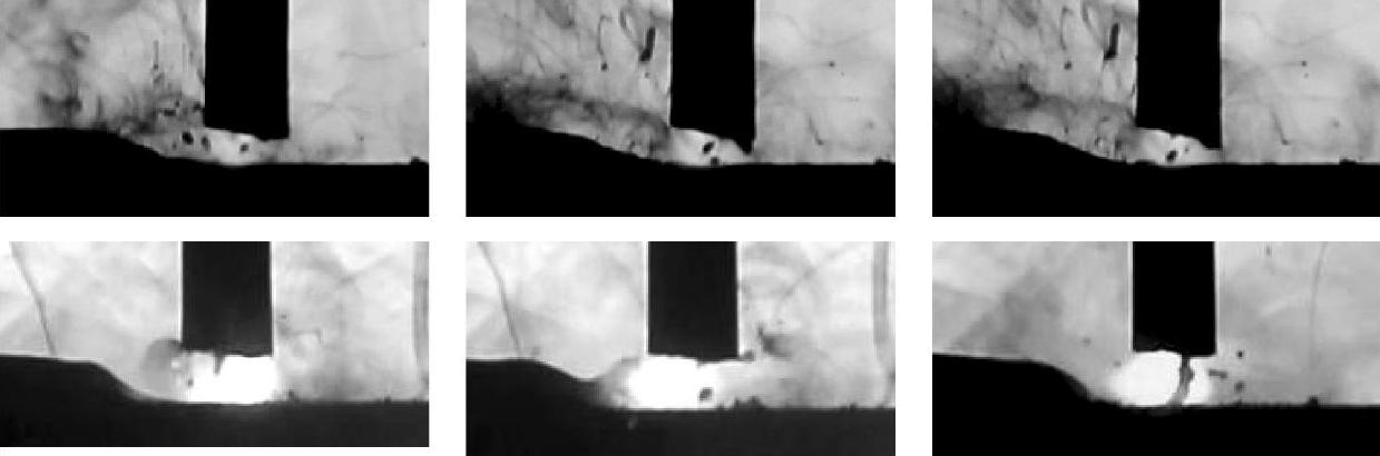 既然渣壁过渡也是钛钙型结构钢焊条常见的熔滴过渡形态之一,那么飘离飞溅现象也应该是钛钙型结构钢焊条常见的飞溅形式之一。事实上结构钢钛钙型焊条发生熔滴的飘离飞溅现象是比较常见的。图3-16是发生飘离飞溅的典型照片,飘离飞溅是由于套筒内气流的吹送使在套筒边缘的悬滴飞离形成了飞溅(图3-16a),也可能是悬挂在套筒边缘的熔滴由于受到电弧力的作用而飞离(图3-16b第1帧照片显示了电弧力的作用)。