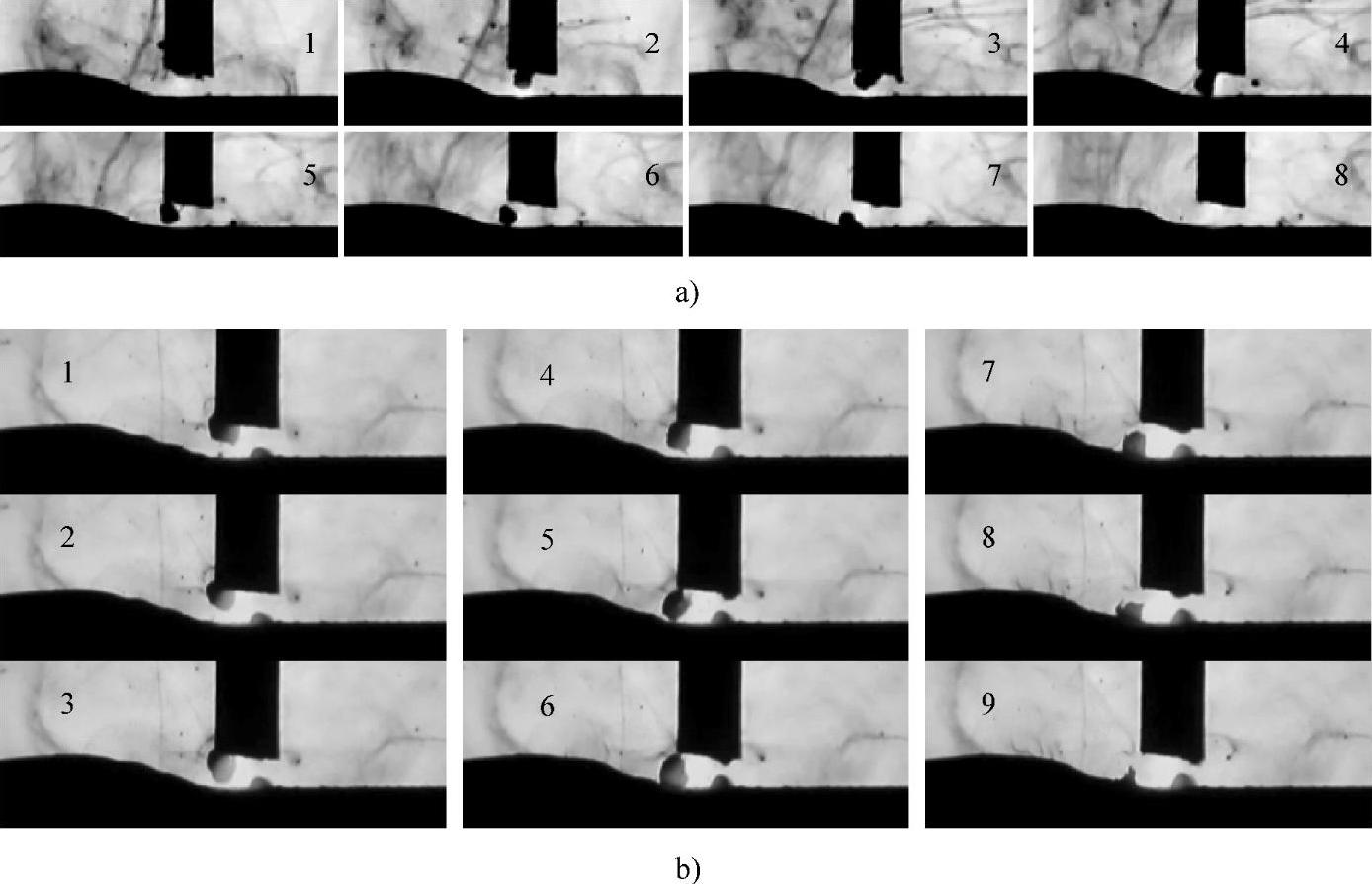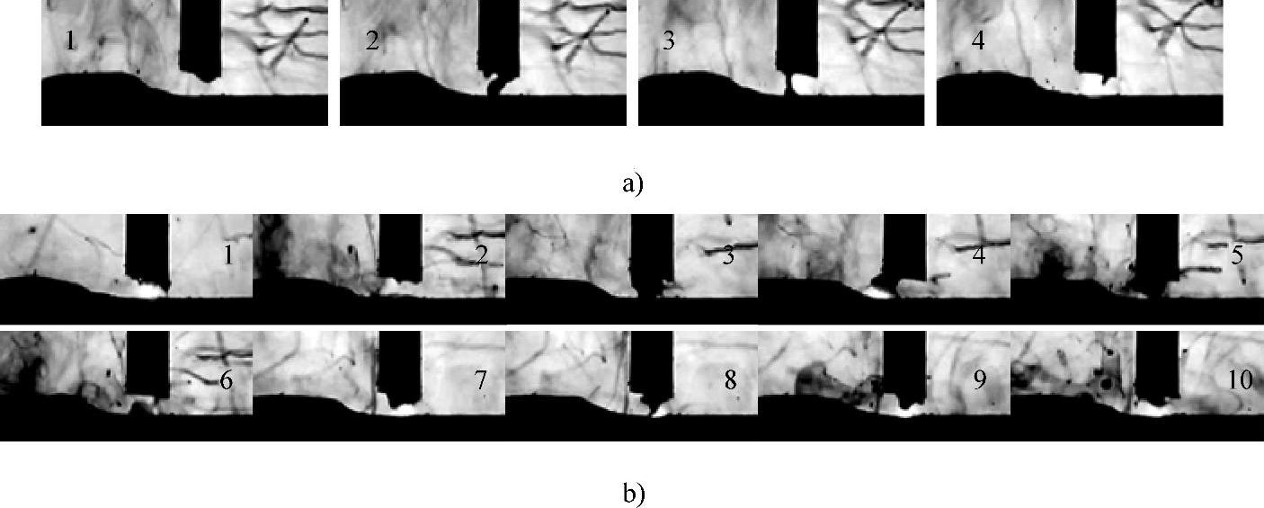 a)由于套筒内气流的吹送形成的飞溅 b)由于电弧力的作用形成的飞溅焊条样品:J422焊条, φ 3.2mm;直流反接, I =100~110A;拍摄速度:1200f/s。
