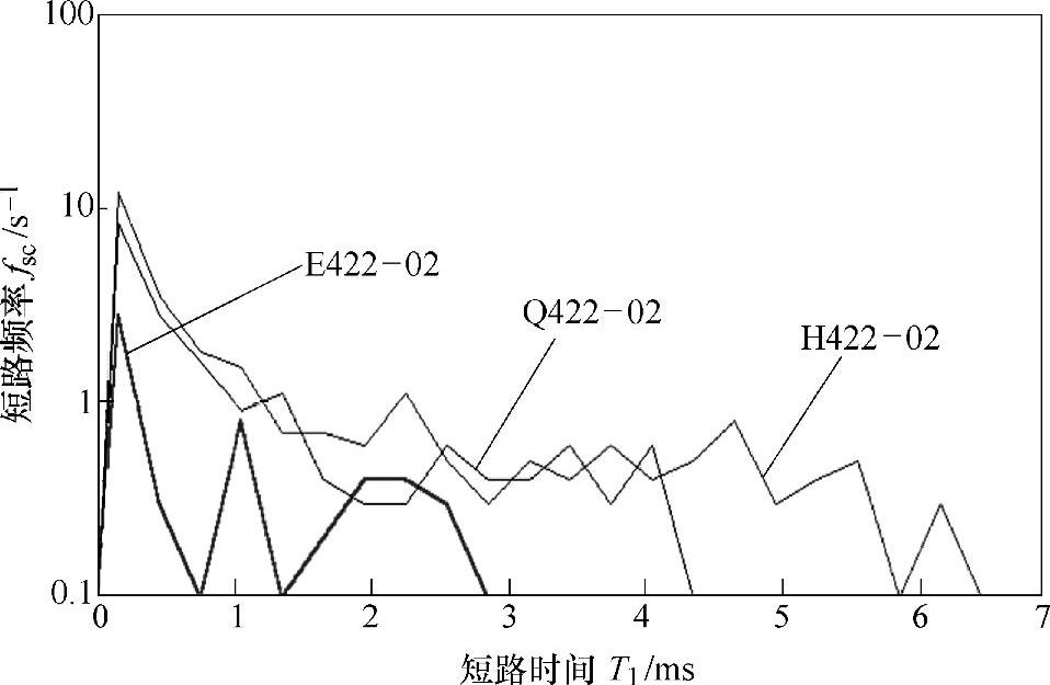 图3-29是三种样品不同短路时间 T 1 的频率分布图,由图看出E422-02样品曲线分布向左集中,最长的短路不超过3ms,Q422-02短路时间分布最高达到4ms,而H422-02焊条样品短路时间的分布要分散的多,最高超过了6ms。测试得到的E422-02样品大于1ms的平均短路时间 T 1 为1.800ms,是三种焊条样品中平均短路时间最短的,Q422-02和H422-02样品平均短路时间分别是2.630ms和3.234ms。平均短路时间越短表明焊条熔滴尺寸越小。