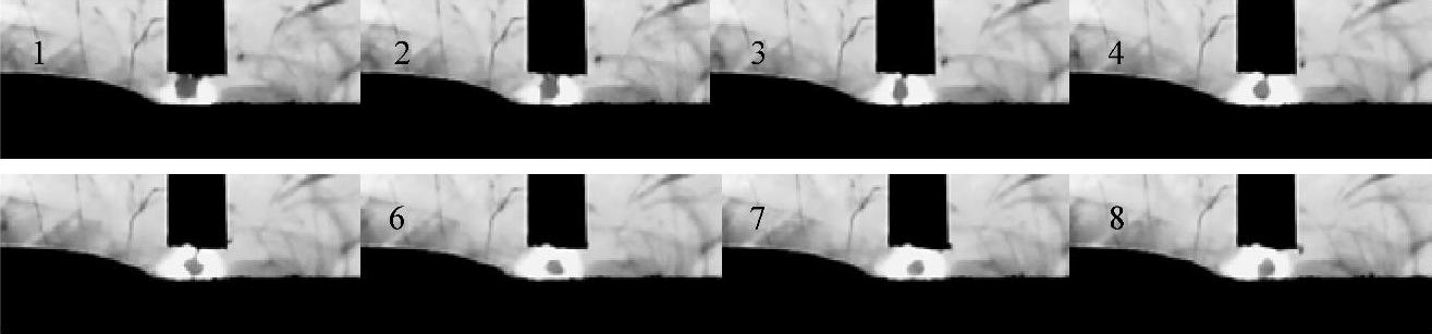 (1)粗熔滴短路过渡 粗熔滴短路过渡是钛钙型结构钢焊条熔滴过渡的主要形态之一,图3-1为钛钙型结构钢焊条典型短路过渡过程的高速摄像照片,从图中看出,熔滴的直径超过了3mm(焊条规格为3.2mm,药皮外径为5.1mm),从第11帧照片至33帧照片为熔滴短路和熔滴过渡,短路时间约为18.3ms,而图3-2显示的熔滴短路过程的时间约为6.7ms(第8~15帧照片),持续时间都相当长。