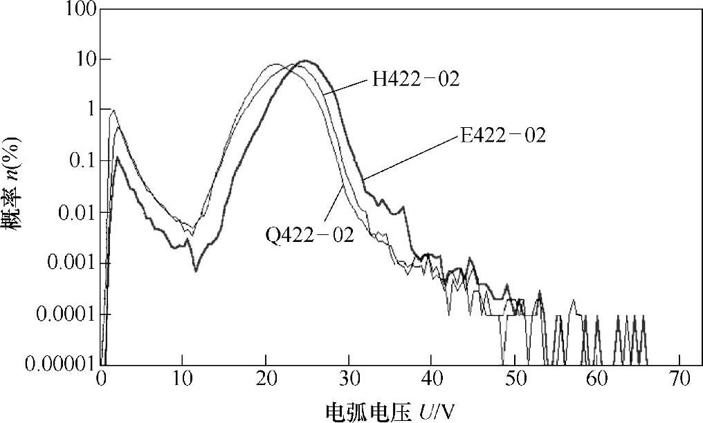 由图3-27电弧电压概率密度分布图可以看出,该图具有双驼峰形状,表现出钛钙型结构钢焊条的一般特征。但三种焊条样品表现有所不同,E422-02样品小驼峰曲线最靠下,说明E422-02样品短路概率比H422-02和Q422-02更小一些,由分析仪提取的数据对三个样品的短路概率进行统计,得到的E422-02、H422-02和Q422-02焊条样品短路电压概率 n ( U s )分别为0.4344%、3.4678%和1.8904%(表3-3)。H422-02样品的 n ( U s )最大,Q422-02样品其次,E422-02样品最低。测试得到的焊条样品的名义电压(相当于平均电弧电压),E422-02最高为24.52V,而H422-02和Q422-02分别为21.00V和22.45V。