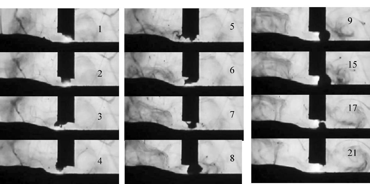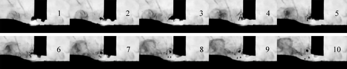 图3-7也是一组反映钛钙型结构钢焊条渣壁过渡高速摄影照片,图中展示了熔滴渣壁过渡全过程,仔细观察发现,在套筒边缘停留着两个小熔滴(第1~4帧照片),其中照片右边的那一个更细小的熔滴被套筒喷出的气流吹送出去,形成飘离飞溅(第6~11帧照片),而左边的那一个熔滴过渡到熔池,它的直径约为2.1mm,渣壁过渡过程持续了至少16ms。