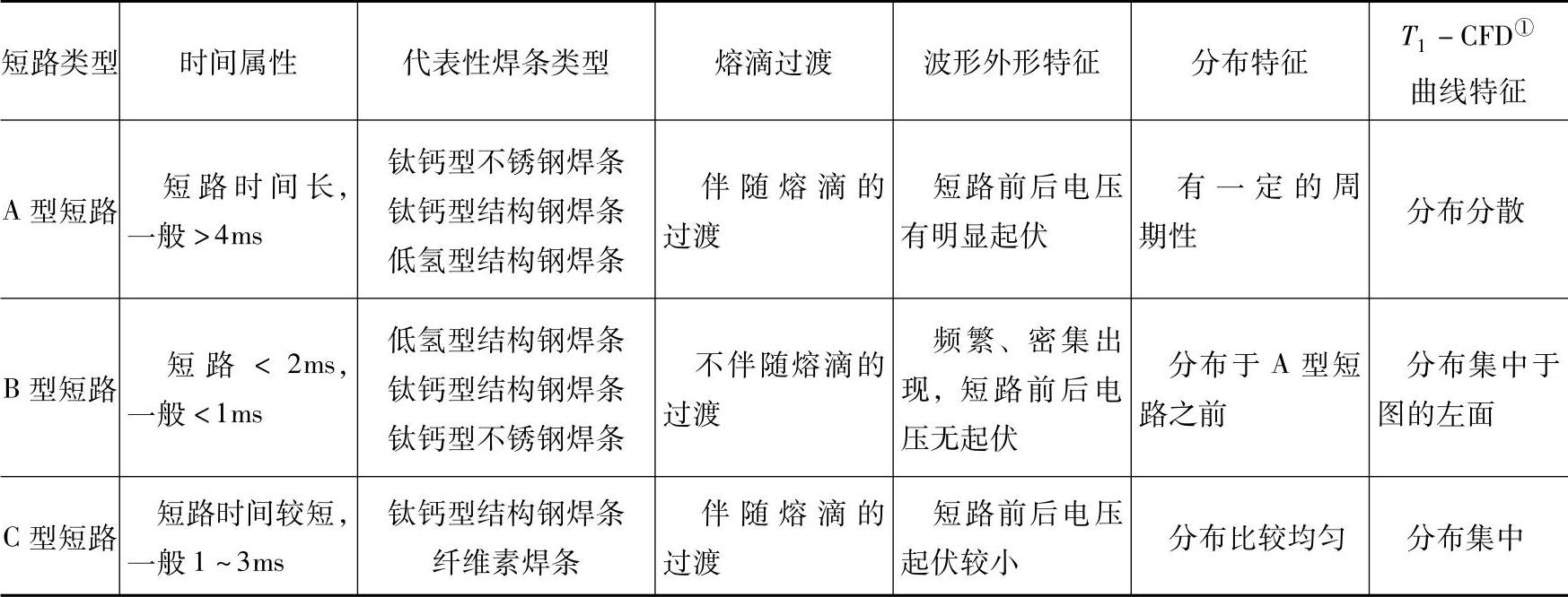 表3-1列出焊条电弧焊A型短路、B型短路与C型短路波形的特征,从时间属性、焊条类型、外形特征和分布、短路时间频率分布图特征等方面进行了概括。