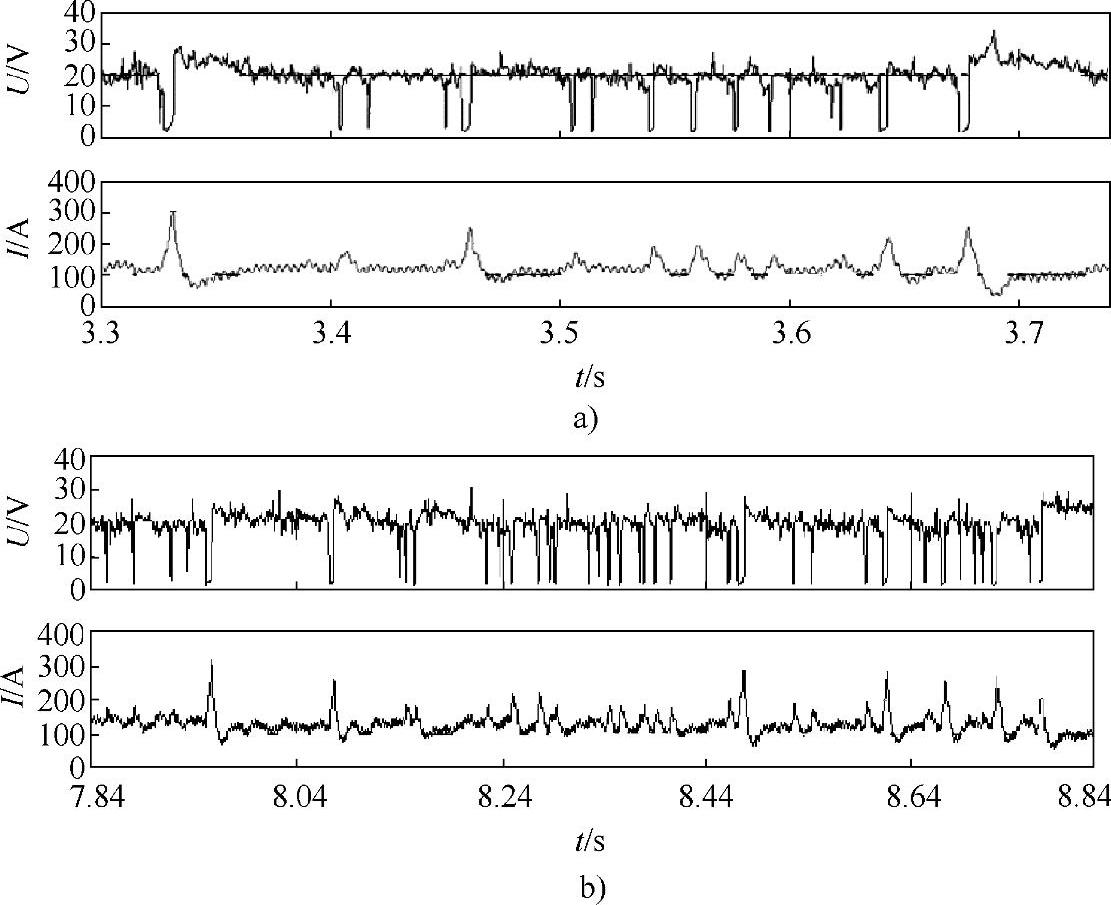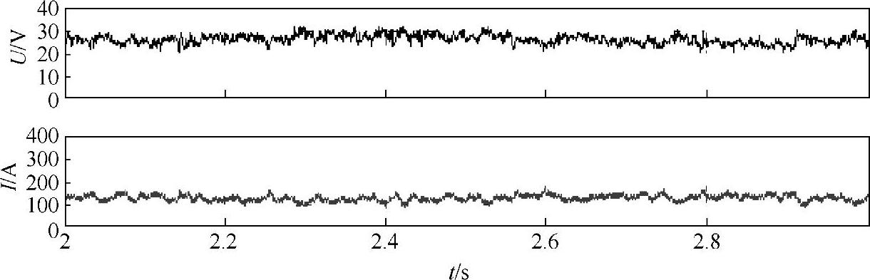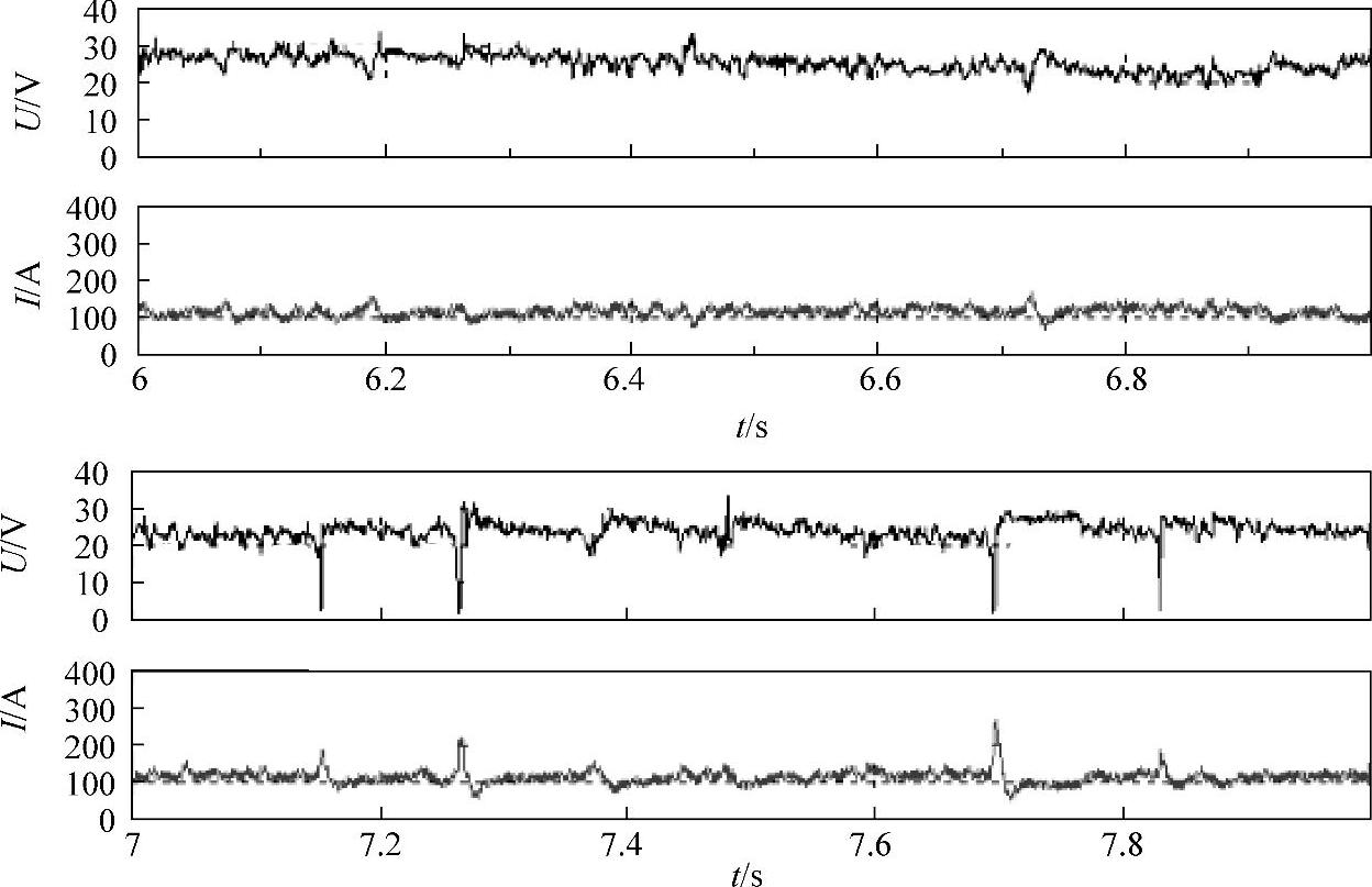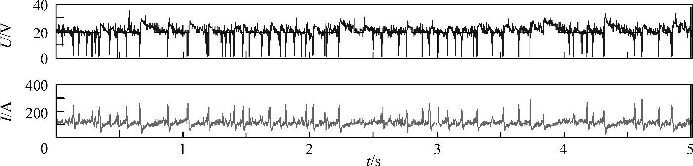图3-30 焊条样品电弧电压、焊接电流波形图