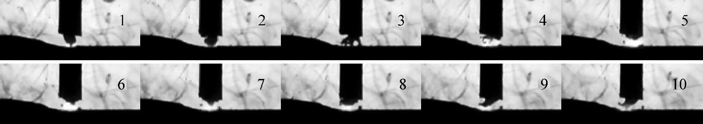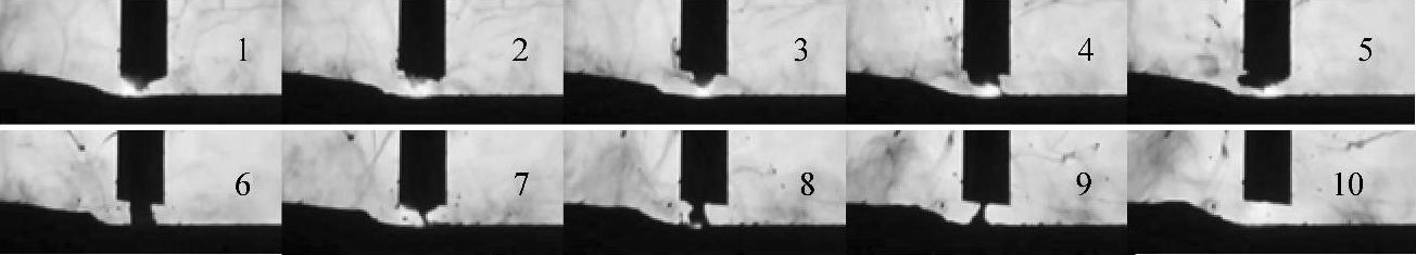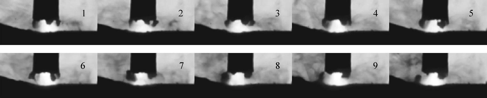 (2)细熔滴短路过渡 图3-3为钛钙型结构钢焊条的另外一种细熔滴短路过渡形态的照片,在图中第6帧照片看出短路时间很短,短路后即刻发生了桥接并完成了熔滴的过渡,接着第7~9帧照片发现过渡后残留的金属细滴又与熔池发生了短路和金属的过渡,这两次熔滴短路的时间都十分短暂,不到1ms。这种瞬时短路又伴有熔滴过渡的短路形式定义为C型短路 [4,5] 。