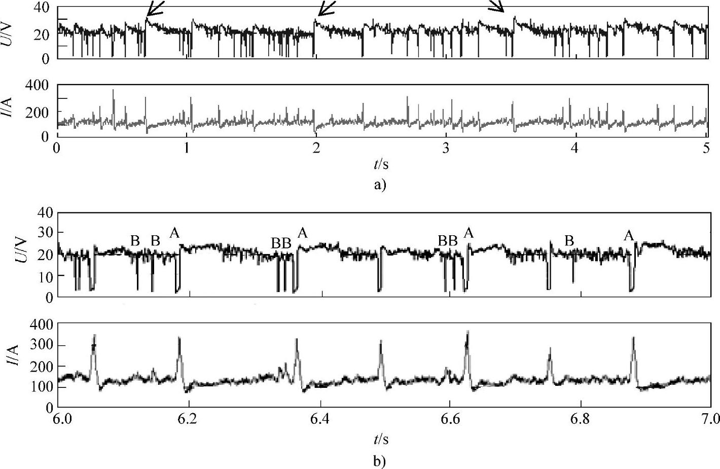 图3-18所示为反映粗熔滴短路过渡特征的波形,由图3-18a可以看出电弧电压波形最突出的特点是出现较大的电压起伏(在箭头指处),也就是说在熔滴发生短路前,电压波形处在最低值,而在熔滴过渡后电弧重燃时电压升到高点。这是由于熔滴尺寸大,熔滴的短路和金属的过渡过程时间较长,熔滴过渡前后引起电弧长度的变化十分明显,因此电压波形出现较大的起伏,这种反映较大熔滴金属过渡的波形被定义为A型短路波形。
