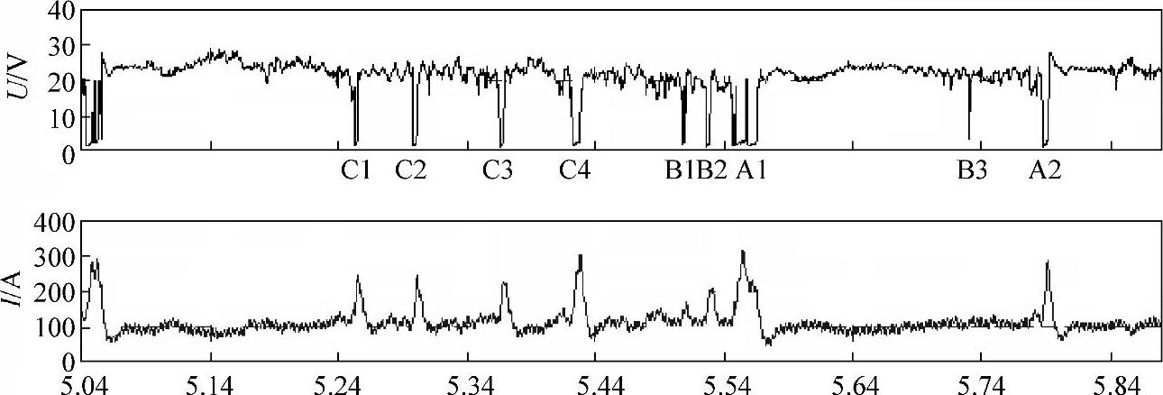 图3-24 具有C型短路的电弧电压、焊接电流波形图
