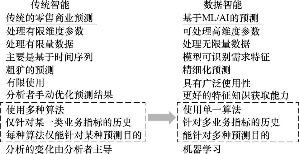 接下来,我们再来看一下传统意义上的智能和数据智能。高盛有一个分析,认为传统的智能与数据智能有几点主要差异:
