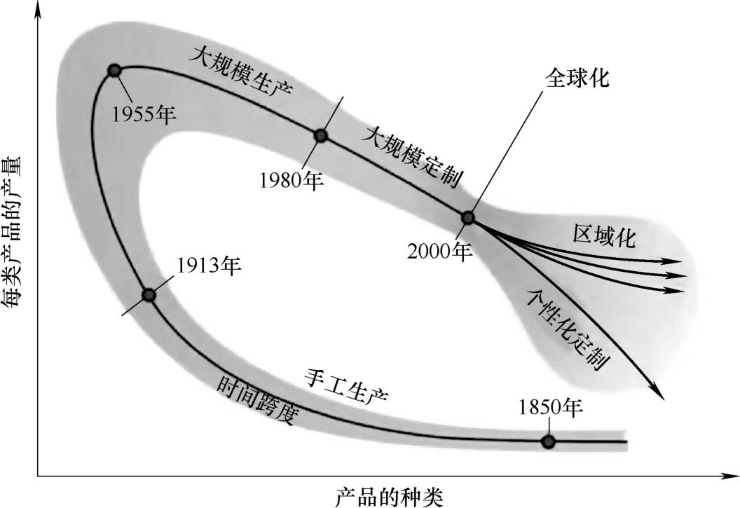 时间进入20世纪80年代以后,形势有了新的变化。大家在反思,制造业沿着这个曲线走,是不是我们真正想要的?我们是不是就要这样一个社会,它越来越简单、越来越一致、越来越低价?这是不是跟我们的人性相悖?后来有人甚至说,要是能回到150年前享受那种个性化就好了。当然这只是一个想法而已。进入21世纪以后,随着计算机、通信等技术的发展,人们重新开始探讨产品多样性和大批量制造的高质量与低成本、一致性、标准化能否达成妥协。