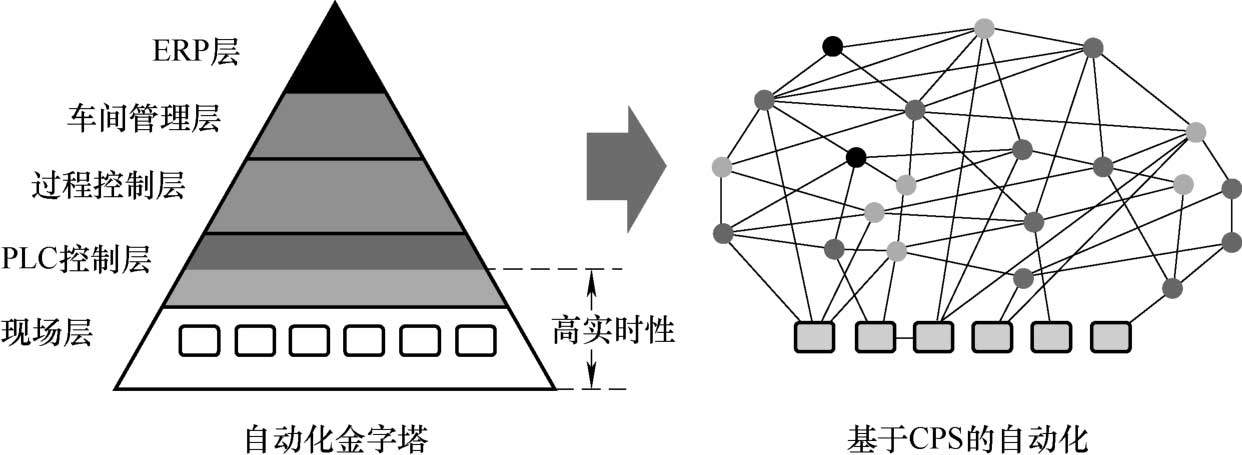 图1-6 从金字塔层次结构到CPS(Cyber-Physical Systems,信息物理系统)的范式转变