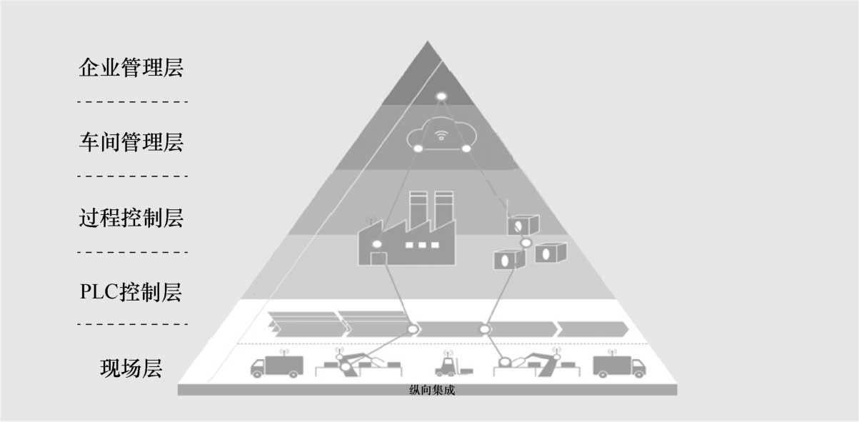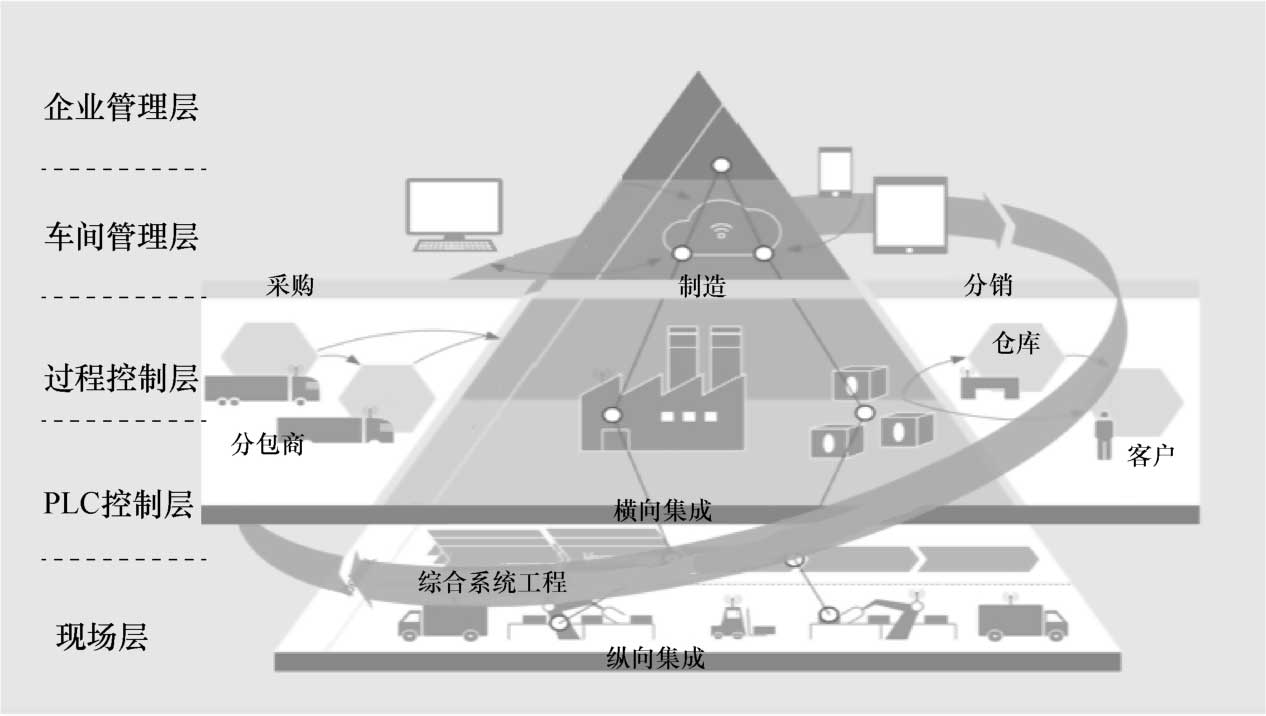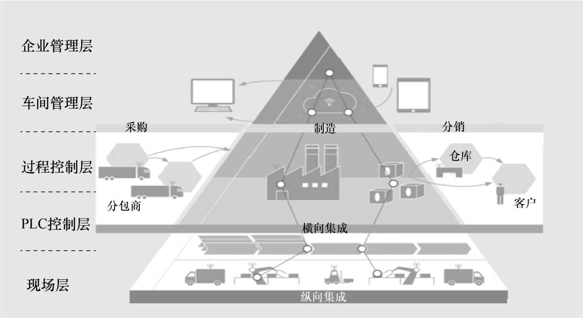 数十年来,制造业无论是什么行业,无论大小公司,都在这个金字塔框架之下,大家按照这个层次来布局和管理企业。进入21世纪以后,随着信息与通信技术的发展,数据变得越来越重要,这个生产模式悄然发生了一些改变。发生了一些什么样的改变呢?比方说,制造过程数据原来只在设备上保存,只要生产线的主管就可以管理,他没必要汇报给公司高管,最多汇报给车间主任即可。而现在,大家追求个性化以后,数据的流转变得非常重要,一个企业必须快速适应这种变化,导致企业的总经理也要关注第一线的事。所以,数据就必须从最底层一直穿透到最上面。而最上面一层不再是ERP,而是一朵云,也就是说,数据要穿透企业天花板,一直到达云端。数据上传到云端,是为了跟企业之外的其他利益相关者,诸如供应商、客户、合作伙伴等分享数据。只有把数据分享出去,大家才能协同。所以,数据和信息就穿透或打破了企业的边界,既把企业的“房顶”揭开,又把“四面墙”推倒,数据要超越企业,然后与上下左右形成数据集成,这两个维度的变化叫作纵向和横向的集成(图1-3、图1-4)。