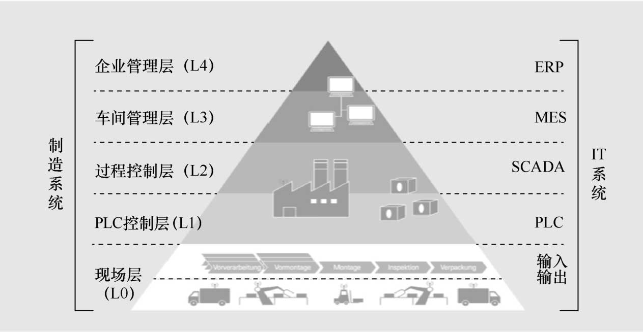 制造业发展到今天,智能制造初现端倪,为回答上述问题提供了有力的支撑。图1-2所示的这个金字塔有五层结构,最下面是L0,最上面是L4。L0层包括生产设备、操作人员、产品、原材料。L1层是PLC(Programmable Logic Controller,可编程逻辑控制器)控制层,包括PLC等控制器,它们很好地管理着下一层的生产设备。L2层叫作SCADA(Supervisory Control And Data Acquisition,数据采集与监控系统)层,这一层就跟数据有关了,目的是时刻知道设备是否正常。L3层是MES(Manufacturing Execution System,制造执行系统)层,过去大家都不太关心,但随着多品种小批量需求的提出,为了把不同的订单在同一个产线当中进行合理的安排,排产变得非常重要。同时生产过程的质量追溯变得非常重要,因为产品在不断地切换,一切换就会带来不稳定,从而导致缺陷。综合起来,对产品质量跟踪和追溯的要求、对排产的优化要求、对设备管理的要求、对人的要求等,使得MES变得越来越重要了。最上面一层叫作企业管理层,即ERP(Enterprise Resource Planning,企业资源计划)。到了企业级运营的层面就是管理资源,资源即人、财、物,当然现在还有一个新的重要资源就是数据。