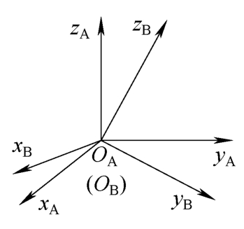 对于机器人的运动控制,除了正确表示空间中某个点的位置,还需要表示物体的方位。物体的方位可以由设置在此物体上的某个坐标系描述。为了表示空间中刚体B的方位,在此刚体上设置笛卡儿坐标系{B}。坐标系{B}相对于参考坐标系{A}的方向余弦组成的3×3矩阵表示刚体B相对于坐标系{A}的方位。