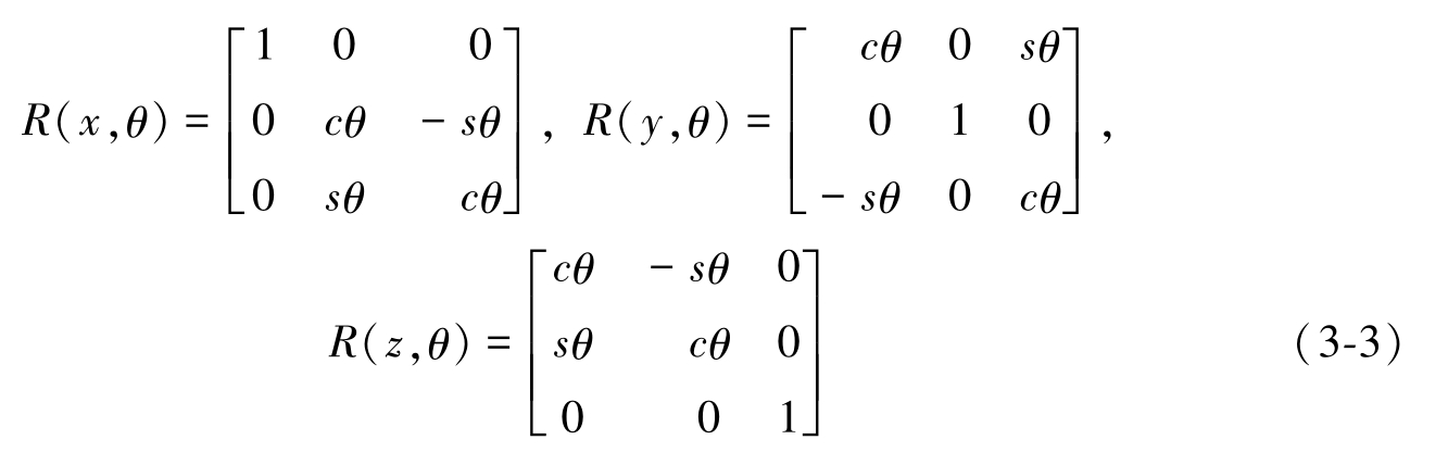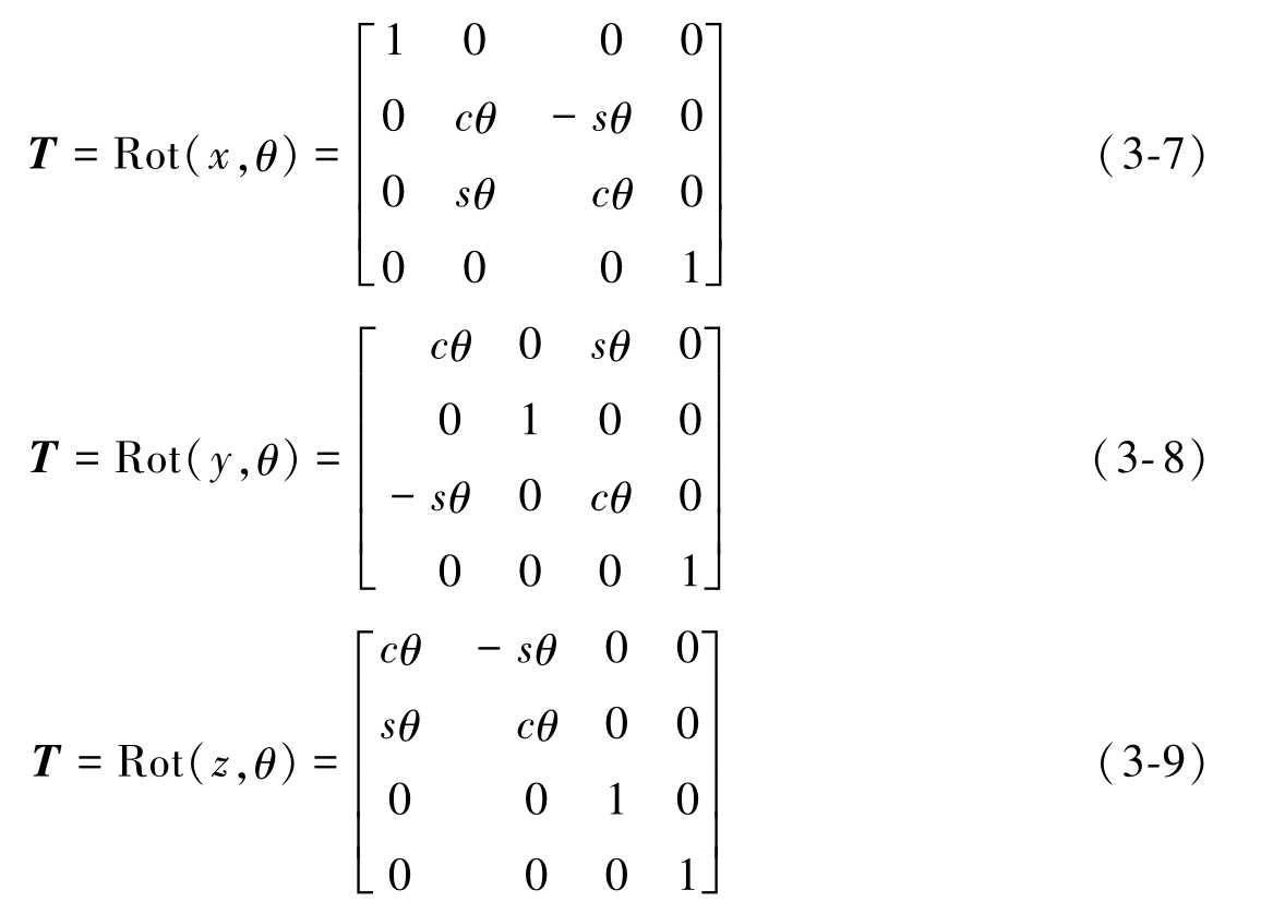 绕 x 、 y 或 z 轴旋转 θ 角度的位姿变化,对应的齐次旋转矩阵分别为